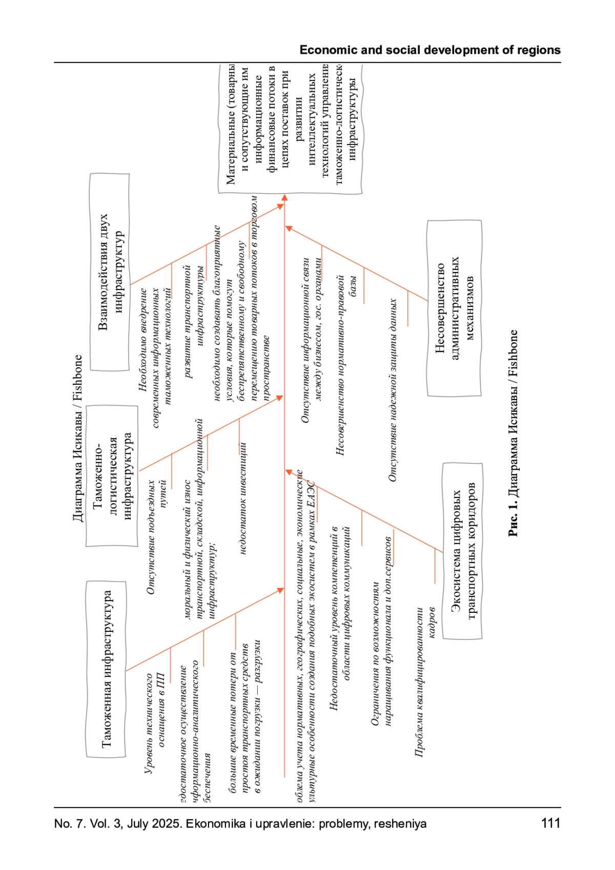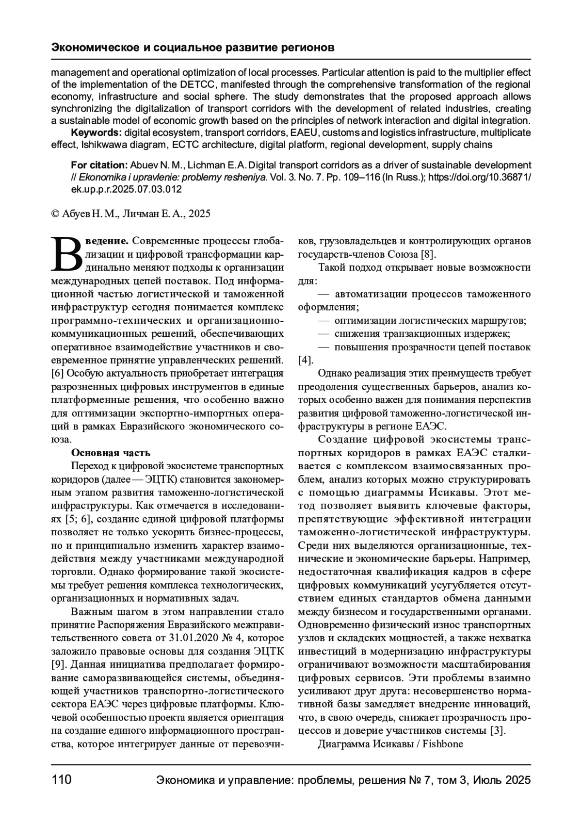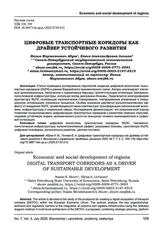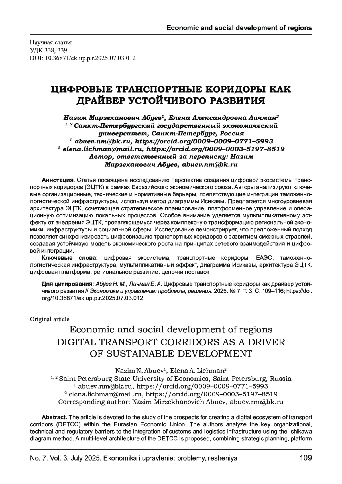 Статья посвящена исследованию перспектив создания цифровой экосистемы транспортных коридоров (ЭЦТК) в рамках Евразийского экономического союза. Авторы анализируют ключевые организационные, технические и нормативные барьеры, препятствующие интеграции таможенно - логистической инфраструктуры, используя метод диаграммы Исикавы. Предлагается многоуровневая архитектура ЭЦТК, сочетающая стратегическое планирование, платформенное управление и операционную оптимизацию локальных процессов. Особое внимание уделяется мультипликативному эффекту от внедрения ЭЦТК, проявляющемуся через комплексную трансформацию региональной экономики, инфраструктуры и социальной сферы. Исследование демонстрирует, что предложенный подход позволяет синхронизировать цифровизацию транспортных коридоров с развитием смежных отраслей, создавая устойчивую модель экономического роста на принципах сетевого взаимодействия и цифровой интеграции.