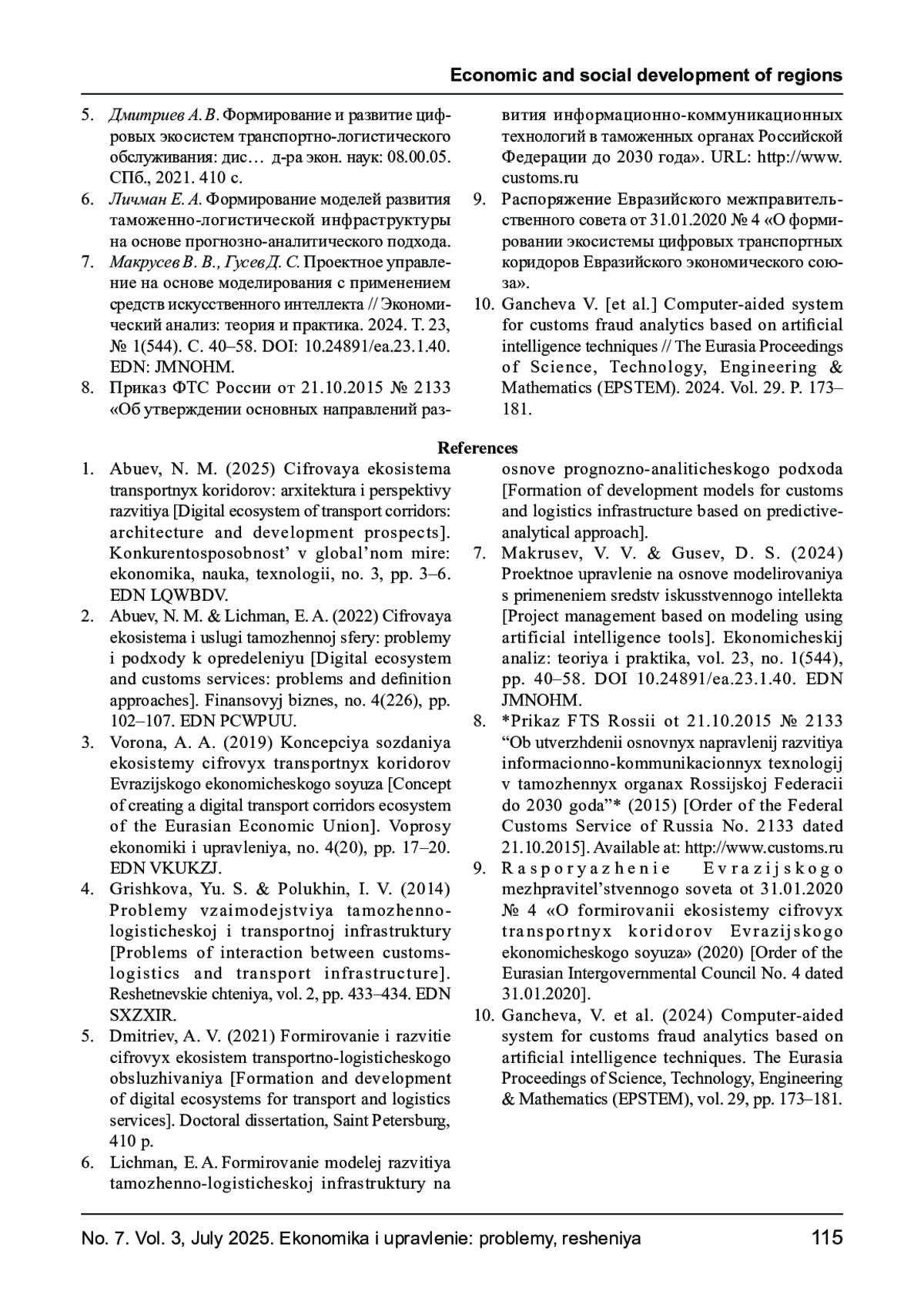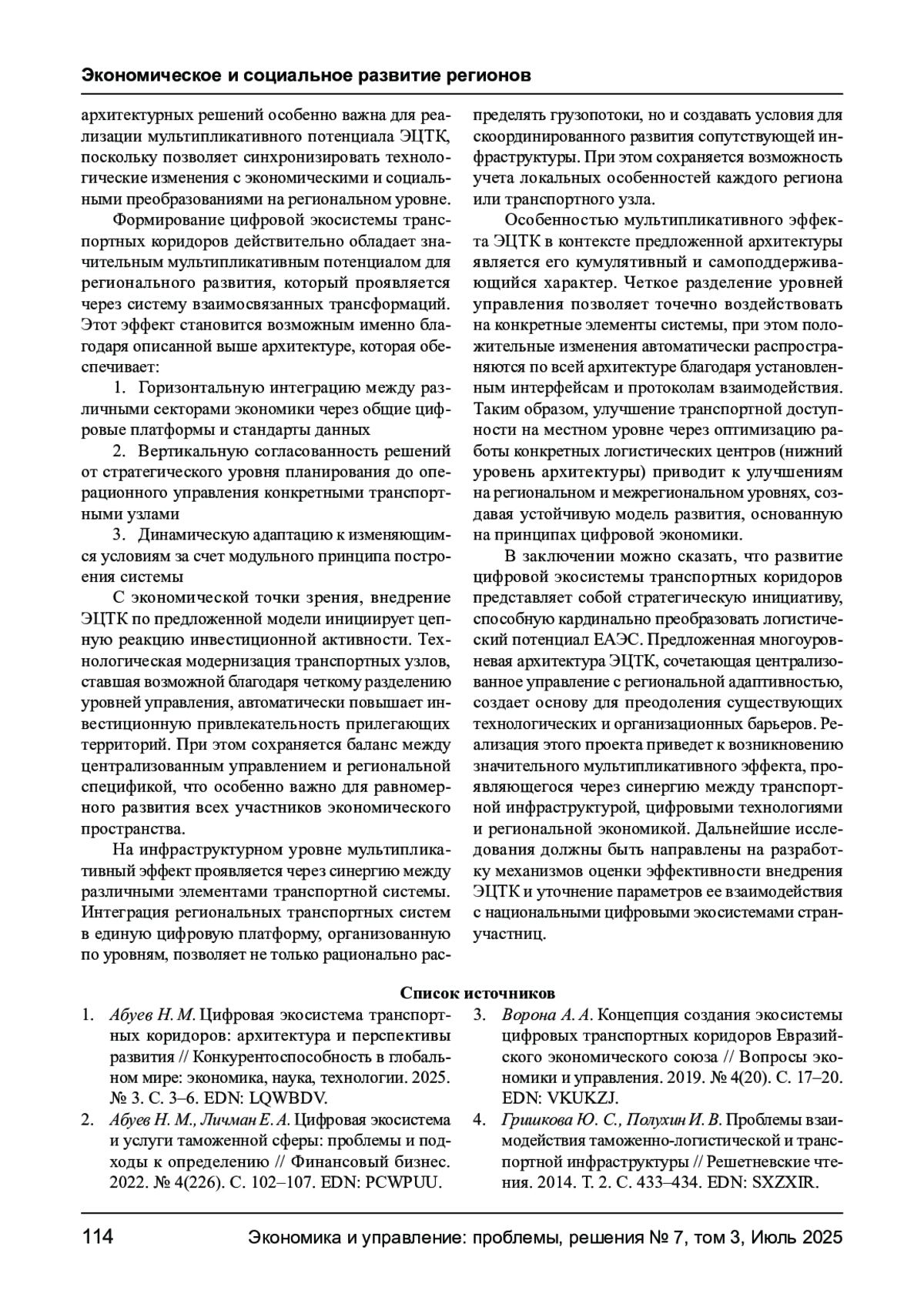 1. Абуев Н. М. Цифровая экосистема транспортных коридоров: архитектура и перспективы развития // Конкурентоспособность в глобальном мире: экономика, наука, технологии. 2025.№ 3. С. 3-6. EDN: LQWBDV