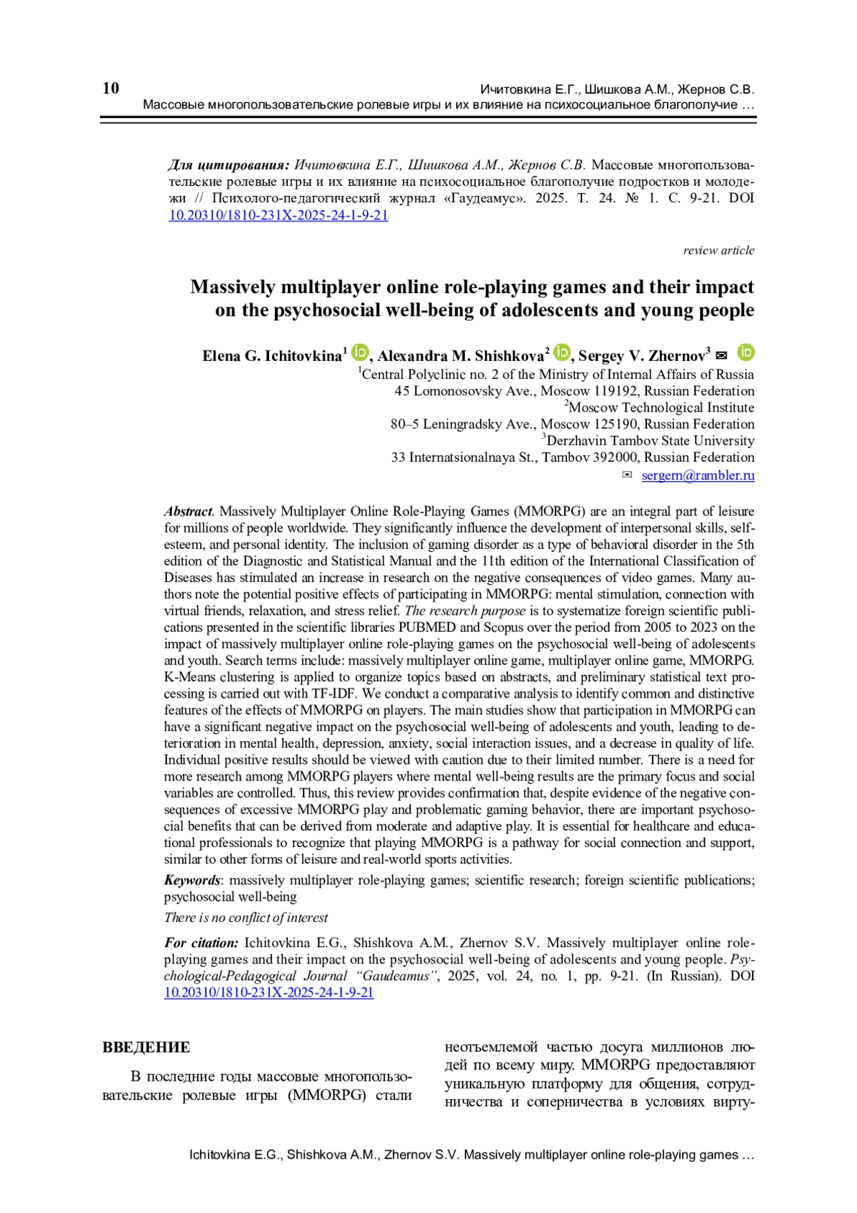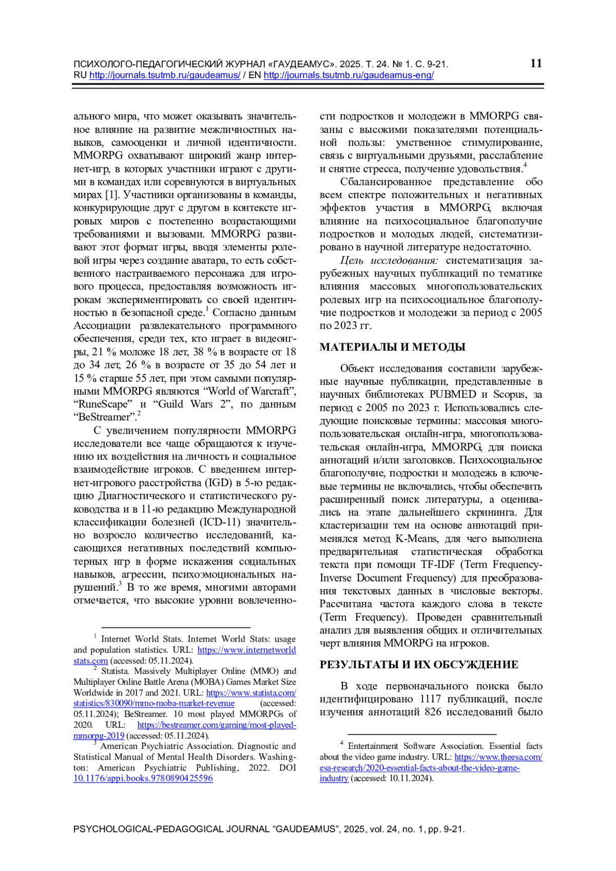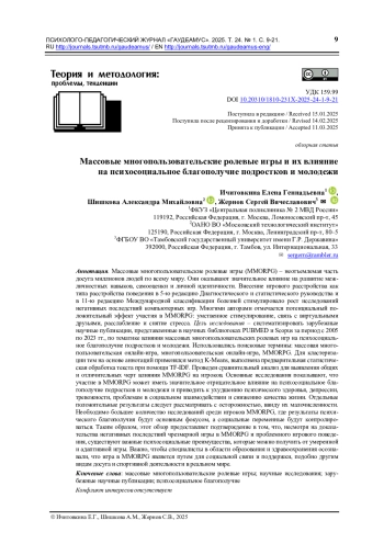 Массовые многопользовательские ролевые игры (MMORPG) – неотъемлемая часть досуга миллионов людей по всему миру. Они оказывают значительное влияние на развитие межличностных навыков, самооценки и личной идентичности. Внесение игрового расстройства как типа расстройства поведения в 5-ю редакцию Диагностического и статистического руководства и в 11-ю редакцию Международной классификации болезней стимулировало рост исследований негативных последствий компьютерных игр. Многими авторами отмечается потенциальный положительный эффект участия в MMORPG: умственное стимулирование, связь с виртуальными друзьями, расслабление и снятие стресса. Цель исследования – систематизировать зарубежные научные публикации, представленные в научных библиотеках PUBMED и Scopus за период с 2005 по 2023 гг., по тематике влияния массовых многопользовательских ролевых игр на психосоциальное благополучие подростков и молодежи. Использовались поисковые термины: массовая много-пользовательская онлайн-игра, многопользовательская онлайн-игра, MMORPG. Для кластеризации тем на основе аннотаций применялся метод K-Means, выполнена предварительная статистическая обработка текста при помощи TF-IDF. Проведен сравнительный анализ для выявления общих и отличительных черт влияния MMORPG на игроков. Основные исследования показывают, что участие в MMORPG может иметь значительное отрицательное влияние на психосоциальное благополучие подростков и молодежи и приводить к ухудшению психического здоровья, депрессии, тревожности, проблемам в социальном взаимодействии и снижению качества жизни. Отдельные положительные результаты следует рассматривать с осторожностью, ввиду их малочисленности. Необходимо большее количество исследований среди игроков MMORPG, где результаты психического благополучия будут основным фокусом, а социальные переменные будут контролироваться. Таким образом, этот обзор предоставляет подтверждение в том, что, несмотря на доказательства негативных последствий чрезмерной игры в MMORPG и проблемного игрового поведения, существуют важные психосоциальные преимущества, которые можно получить от умеренной и адаптивной игры. Важно, чтобы специалисты в области образования и здравоохранения осознавали, что игра в MMORPG является путем для социальной связи и поддержки, подобно другим видам досуга и спортивной деятельности в реальном мире.