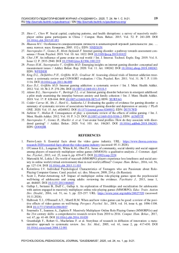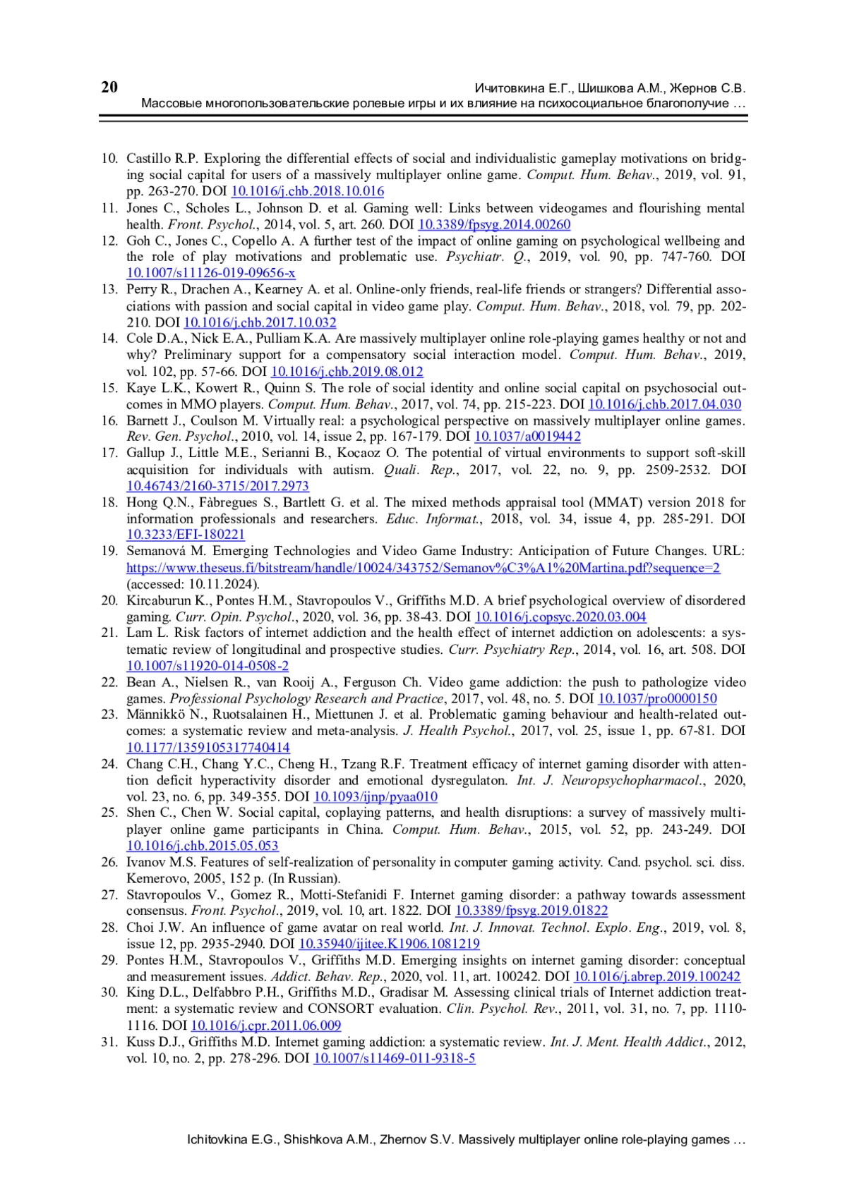 25. Shen C., Chen W. Social capital, coplaying patterns, and health disruptions: a survey of massively multiplayer online game participants in China // Comput. Hum. Behav. 2015. Vol. 52. P. 243-249. DOI: 10.1016/j.chb.2015.05.053