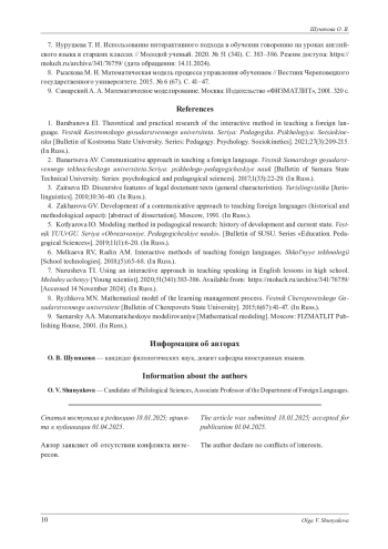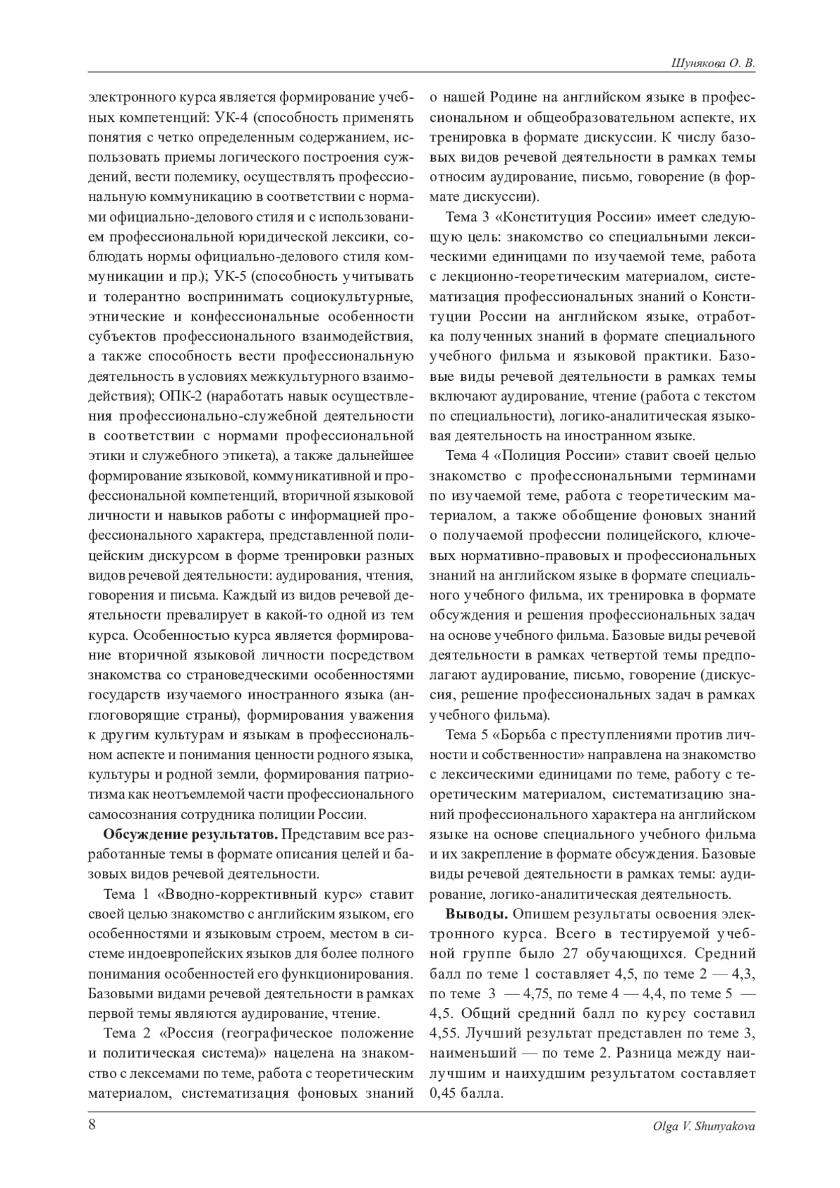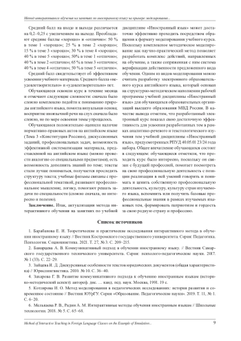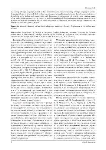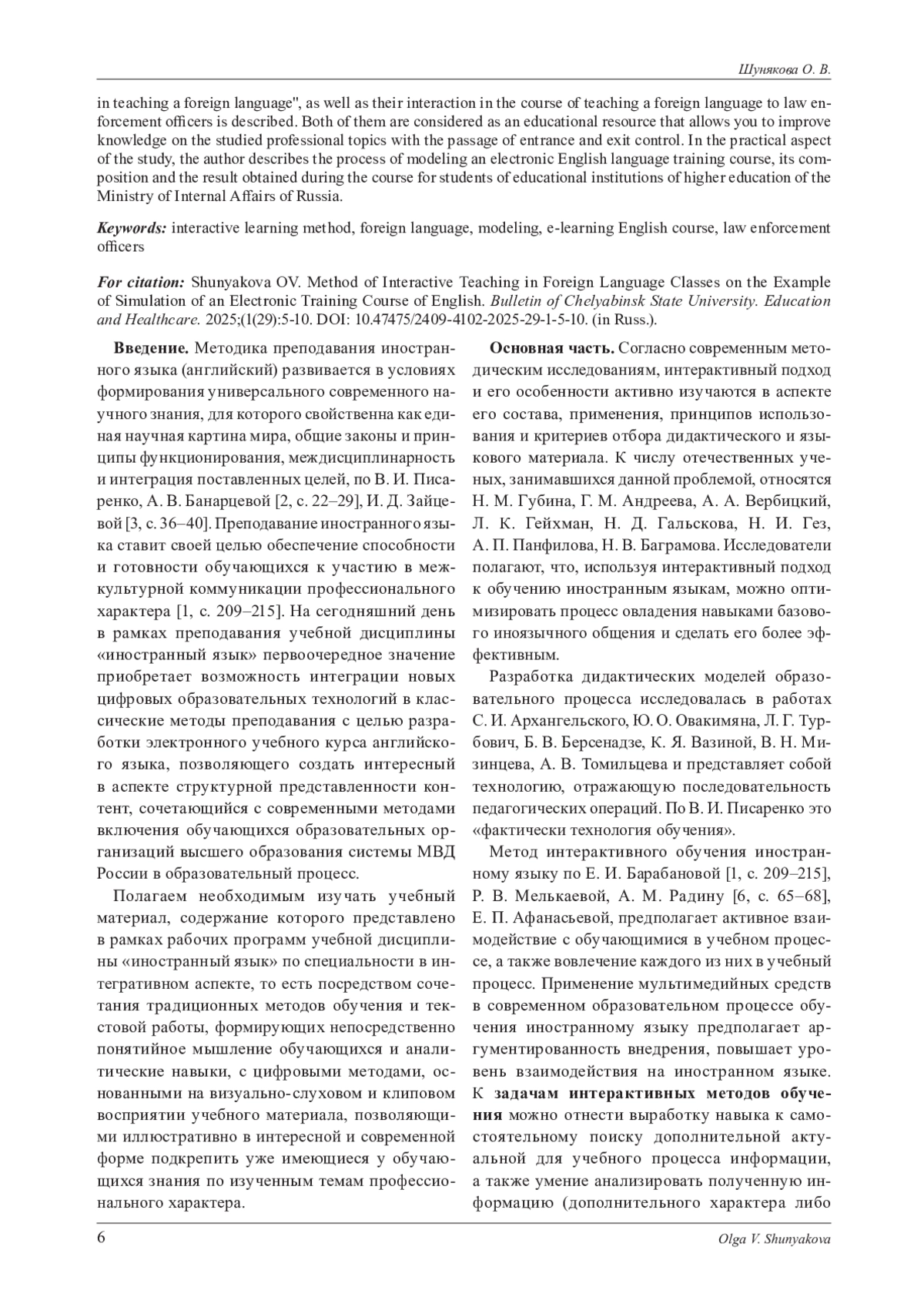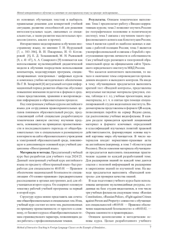 В настоящей статье рассматривается вопрос актуализации метода интерактивного обучения на занятиях по учебной дисциплине «иностранный язык». Экземплификация описанного выше метода обучения дисциплине языкового цикла проходит посредством обращения к формату моделирования как научному методу проверки действенности предложенного вида обучения английскому языку. Интерактивное моделирование в обучении иностранному языку рассматривается как способ закрепления учебного материала. В аспекте теоретической значимости в настоящей статье раскрывается сущность таких понятий как «электронный учебный курс английского языка» и «интерактивное моделирование в обучении иностранному языку», а также дескриптивно представляется их взаимодействие в ходе обучения иностранному языку сотрудников правоохранительных органов. Оба они рассматриваются как образовательный ресурс, позволяющий усовершенствовать знания по изученной профессиональной тематике с прохождением входного и выходного контроля. В практическом аспекте исследования автором описывается процесс моделирования электронного учебного курса английского языка, его состав и полученный в ходе прохождения курса результат для обучающихся образовательных организаций высшего образования МВД России.