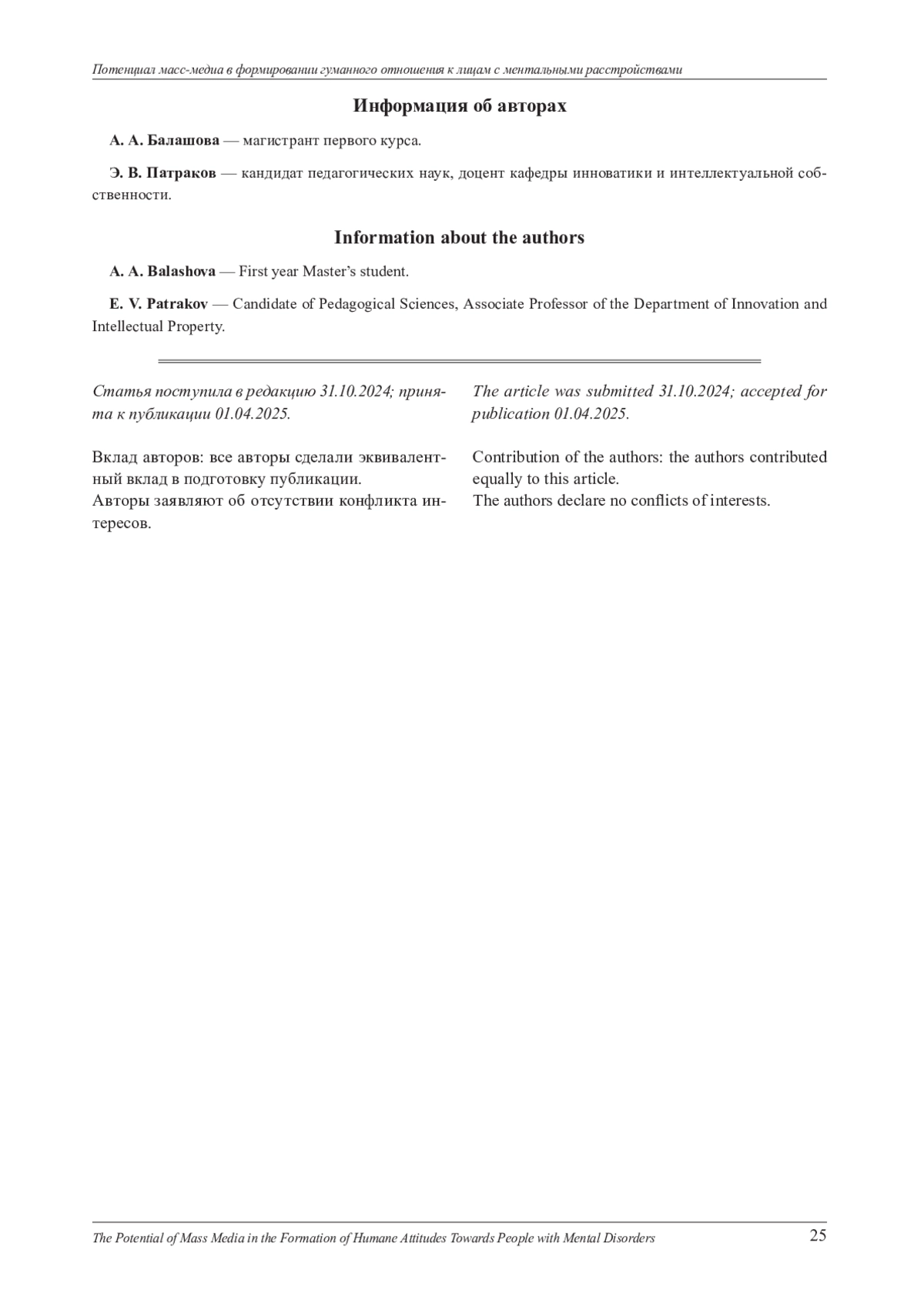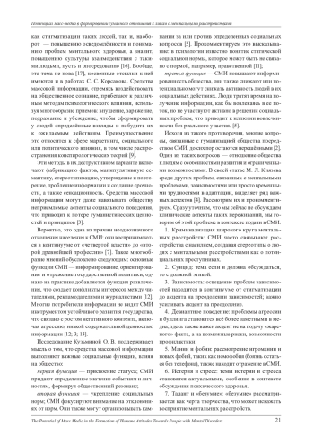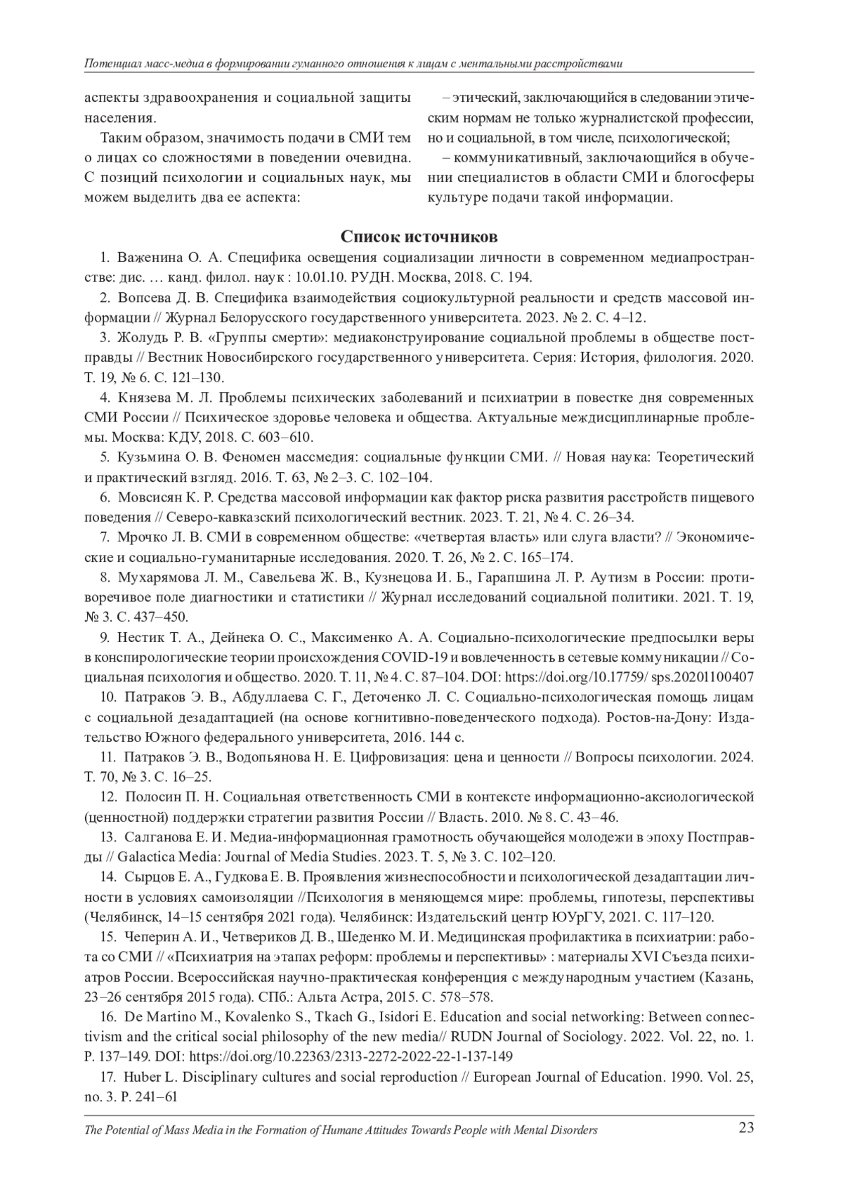 17. Huber L. Disciplinary cultures and social reproduction // European Journal of Education. 1990. Vol. 25, no. 3. P. 241-61 The Potential of Mass Media in the Formation of Humane Attitudes Towards People with Mental Disorders.