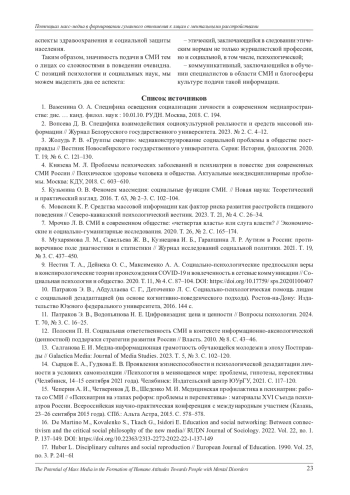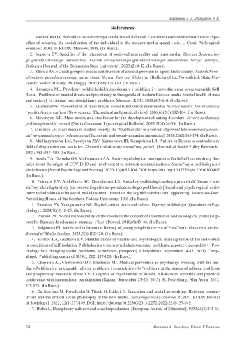 6. Мовсисян К. Р. Средства массовой информации как фактор риска развития расстройств пищевого поведения // Северо-кавказский психологический вестник. 2023. Т. 21, № 4. С. 26-34. EDN: XVLPXM