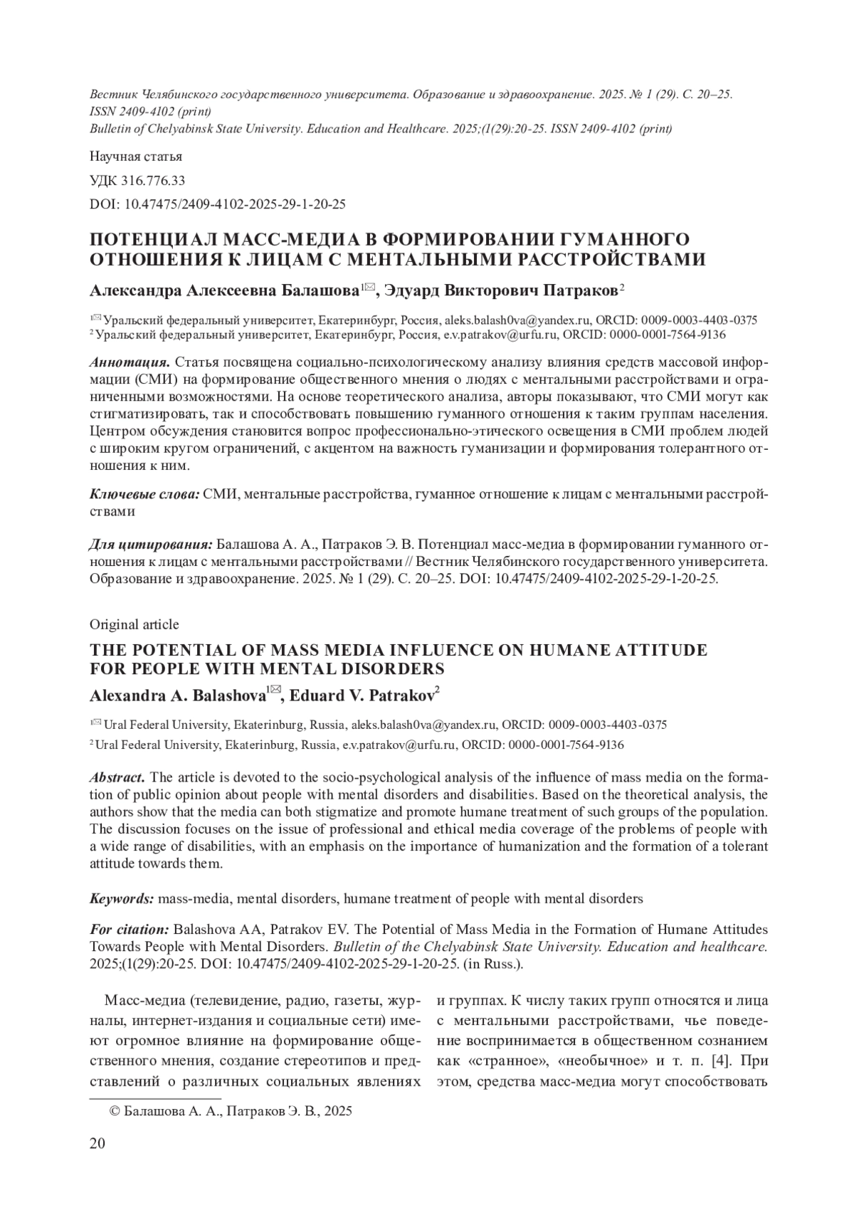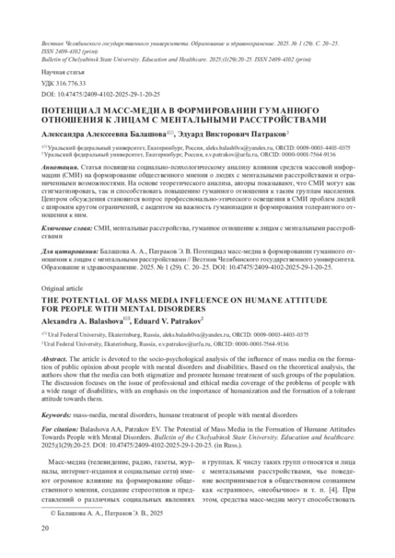 Статья посвящена социально-психологическому анализу влияния средств массовой информации (СМИ) на формирование общественного мнения о людях с ментальными расстройствами и ограниченными возможностями. На основе теоретического анализа, авторы показывают, что СМИ могут как стигматизировать, так и способствовать повышению гуманного отношения к таким группам населения. Центром обсуждения становится вопрос профессионально-этического освещения в СМИ проблем людей с широким кругом ограничений, с акцентом на важность гуманизации и формирования толерантного отношения к ним.