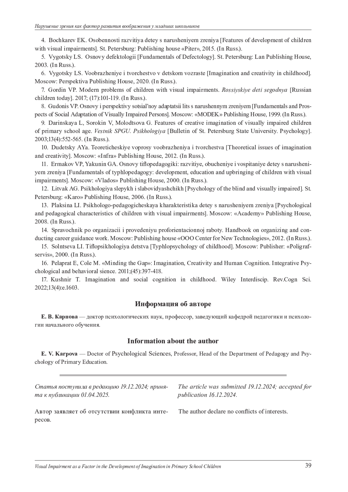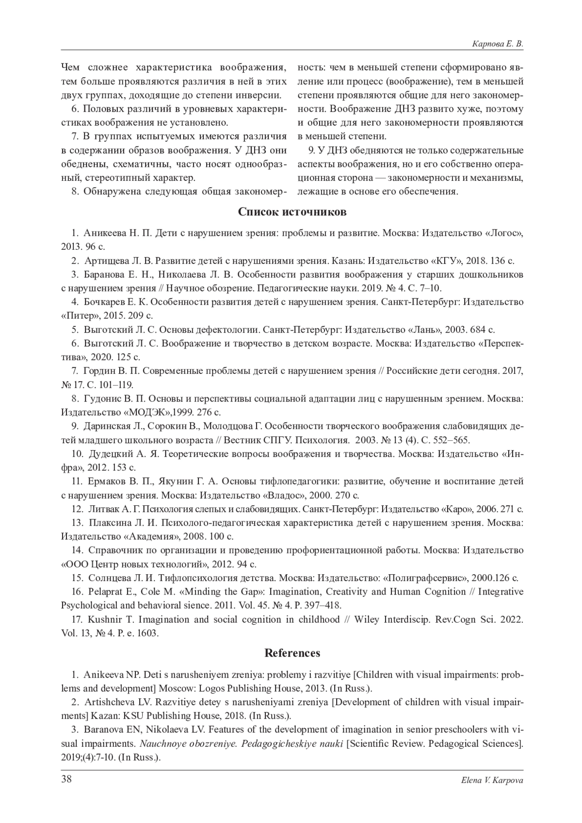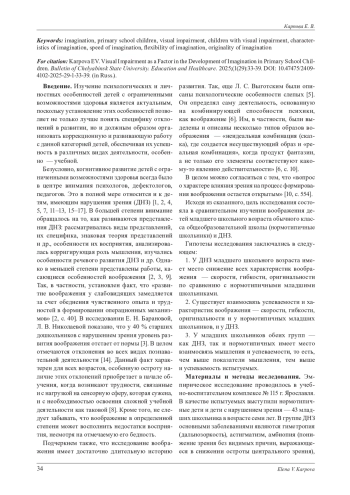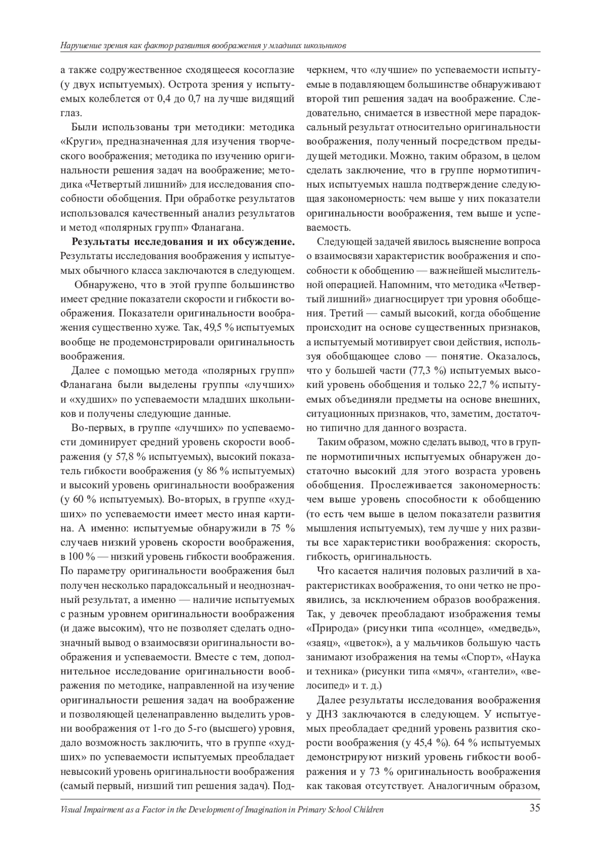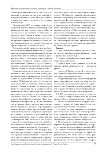 Представлены результаты эмпирического исследования основных характеристик воображения - скорости, гибкости и оригинальности, а также взаимосвязи их со способностью к обобщению как одной из основных операций мышления и успеваемостью у детей младшего школьного возраста с нарушением зрения в сравнении с нормотипичными младшими школьниками. Выявлены количественные и качественные особенности воображения у детей с нарушениями зрения по сравнению с нормотипичными сверстниками. В целом имеются отличия в уровне, степени развития и особенностях воображения у детей с нормальным зрением и с нарушенным зрением. Половых различий в уровневых характеристиках воображения не установлено. Однако в группах испытуемых имеются различия в содержании образов воображения. У детей с нарушениями зрения они обеднены, схематичны, часто носят однообразный, стереотипный характер. Установлено, что степень изменения характеристик воображения определяется сложностью самой характеристики. Чем ближе она к базовой, формально-динамической (скорость воображения), тем меньше степень ее расхождения у детей обычного класса и детей с нарушениями зрения. Чем сложнее характеристика воображения, тем больше проявляются различия в ней в этих двух группах.