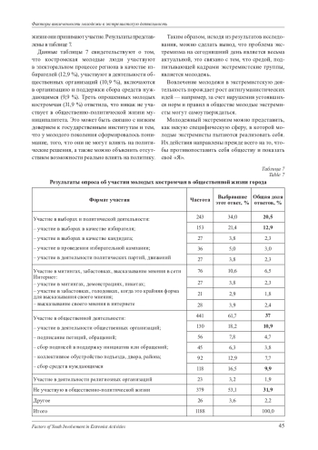 Данная статья посвящена рассмотрению мотивационно-поведенческих факторов вовлеченности людей молодого возраста в экстремистскую деятельность (на примере исследования молодежи города Костромы). Опасность современного экстремизма заключается, в том числе, во вовлечении молодых людей в экстремистскую деятельность, в негативном влиянии на их личность, формировании нравственной и мировоззренческой деградированной личности. В статье представлены результаты исследования степени подверженности экстремистской индоктринированности молодежи города Костромы и уровня вовлеченности её в деятельность экстремистских организаций.