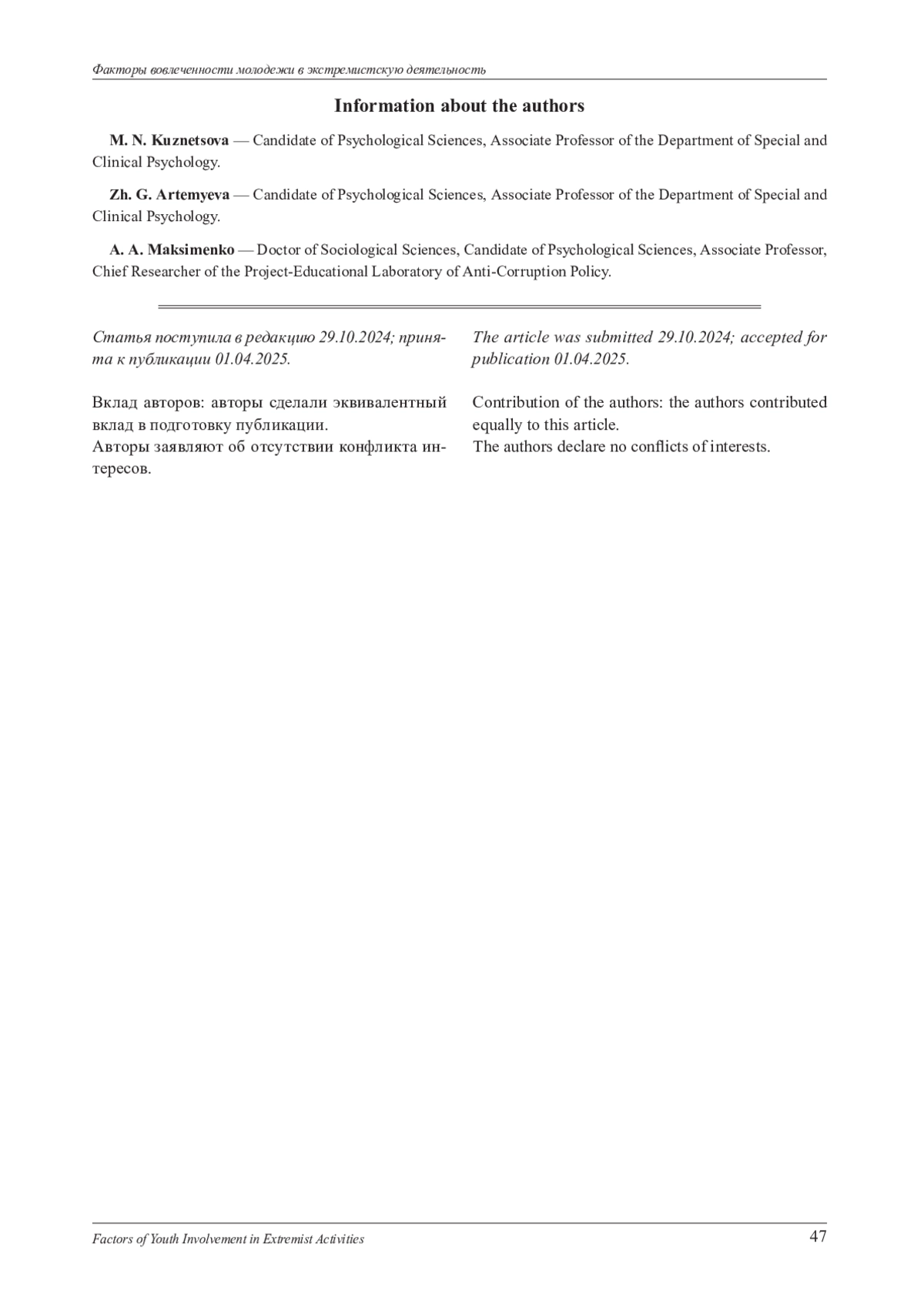 3. Дворянчиков Н. В., Ениколопов С. Н., Сокольская М. Д., Фурсова И. А. Ценностные ориентации правых экстремистов // Психологическая наука и образование. 2010. Т. 15, № 5. С. 92-103. EDN: NBPEDN