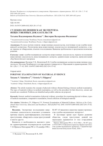 В статье изучено понятие «вещественные доказательства, полученные в ходе судебно-медицинской экспертизы». Рассмотрены виды вещественных доказательств в медицинской экспертизе, а также порядок их обнаружения, изъятия и исследования. Выявлена проблематика и предложены возможные решения.