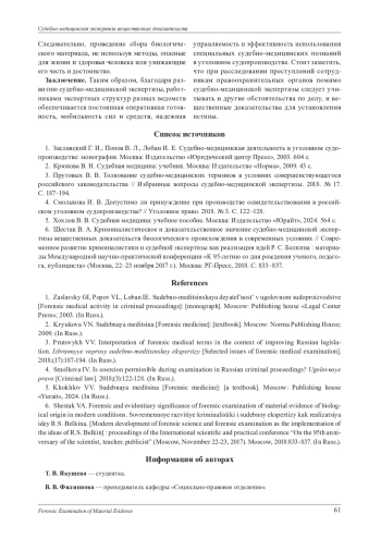 1. Заславский Г. И., Попов В. Л., Лобан И. Е. Судебно-медицинская деятельность в уголовном судопроизводстве: монография. Москва: Издательство “Юридический центр Пресс”, 2003. 604 с.
