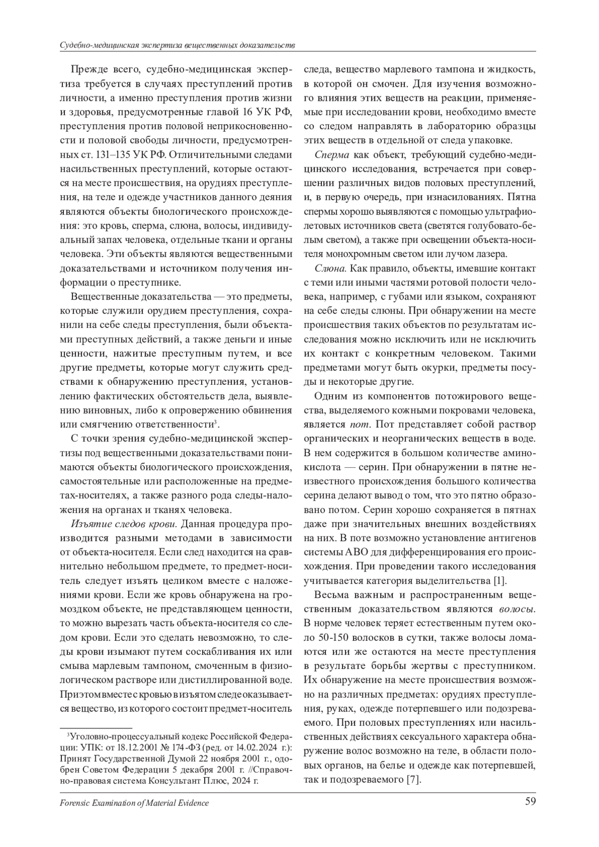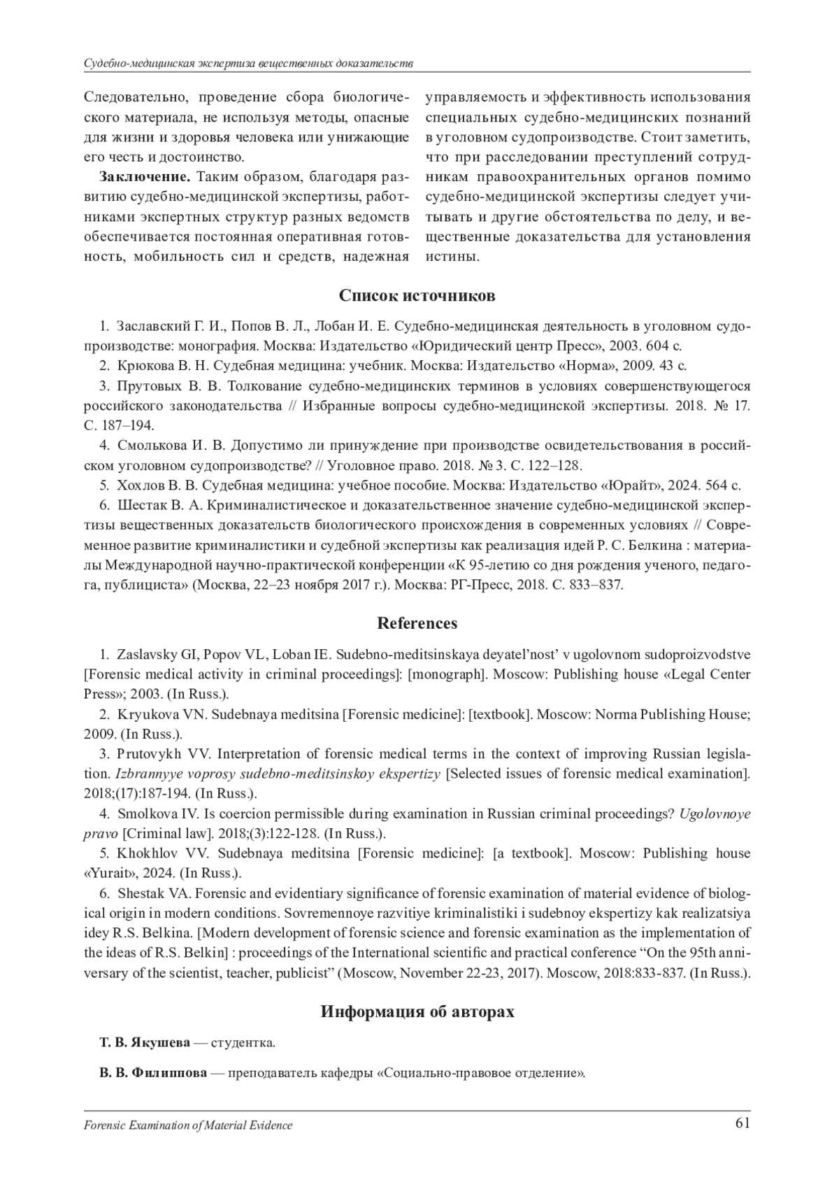 6. Шестак В. А. Криминалистическое и доказательственное значение судебно-медицинской экспертизы вещественных доказательств биологического происхождения в современных условиях // Современное развитие криминалистики и судебной экспертизы как реализация идей Р. С. Белкина: материалы Международной научно-практической конференции “К 95-летию со дня рождения ученого, педагога, публициста” (Москва, 22-23 ноября 2017 г.). Москва: РГ-Пресс, 2018. С. 833-837. EDN: XUVBQT