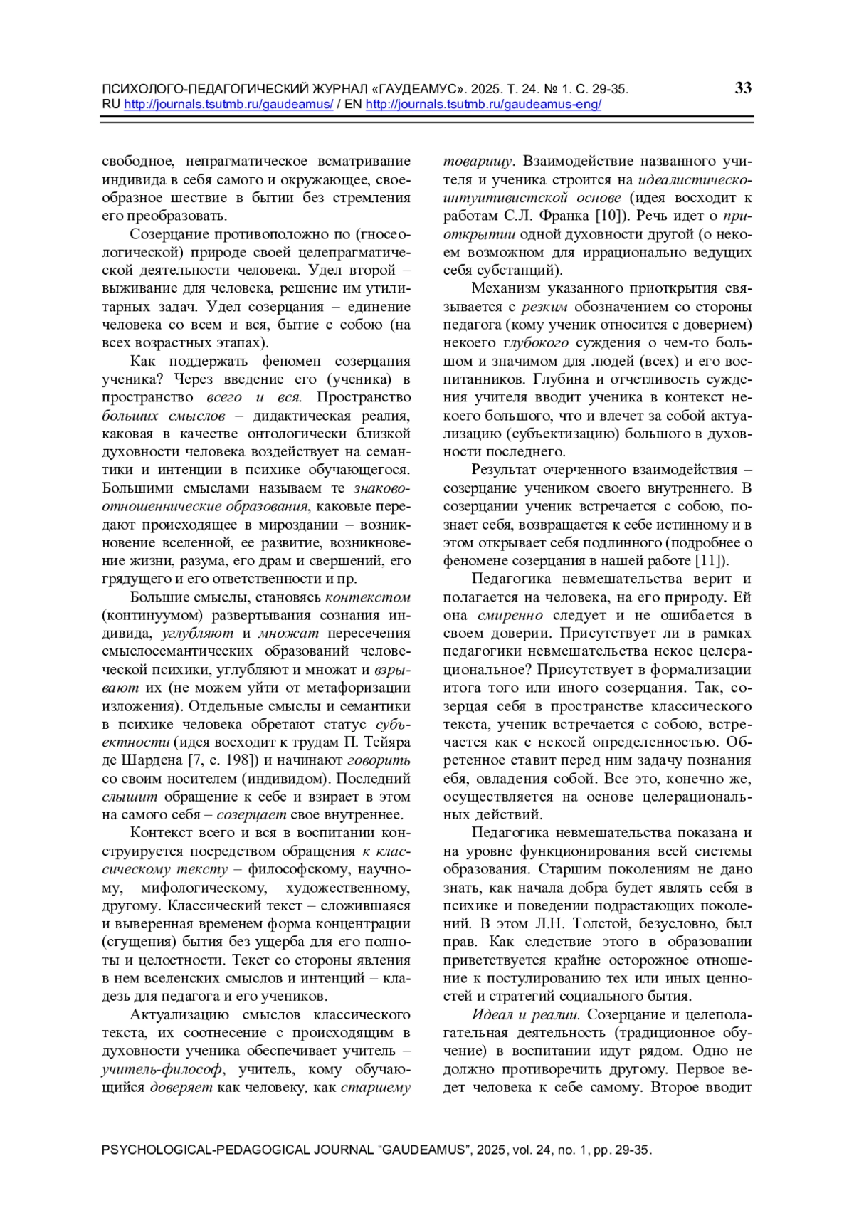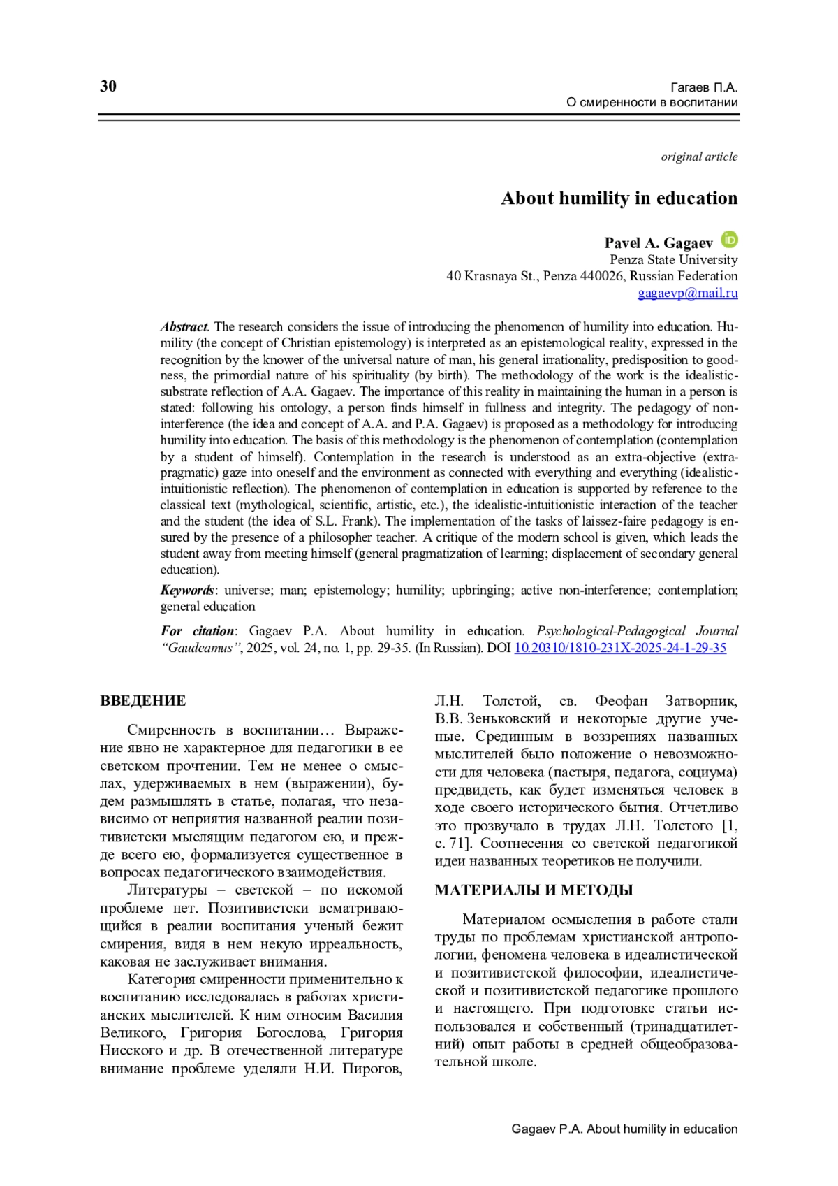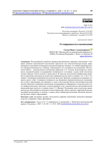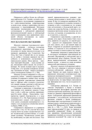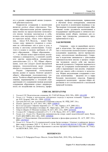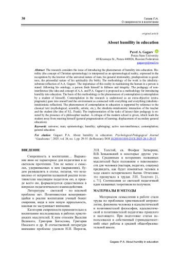 Рассматривается проблема привнесения феномена смирения в воспитание. Смирение (понятие христианской гносеологии) трактуется как гносеологическая реалия, выражающаяся в признании познающим вселенской природы человека, его общей иррационально-сти, предрасположенности к доброму, изначальности его духовности (по рождении). Методология работы – идеалистическо-субстратная рефлексия А. А. Гагаева. Констатируется значимость указанной реалии в поддержании человеческого в человеке: следуя своей онтологии, человек обретает себя в полноте и целостности. В качестве методологии привнесения смирения в воспитание предлагается педагогика невмешательства (идея и понятие А. А. и П. А. Гагаевых). Основанием названной методологии выступает феномен созерцания (созерцания уче-ником самого себя). Созерцание понимается как внецелевое (внепрагматическое) всматривание в себя и окружающее как связанное со всем и вся (идеалистическо-интуитивистская рефлексия). Феномен созерцания в воспитании поддерживается обращением к классическому тексту (мифологическому, научному, художественному и др.), идеалистическо-интуитивистскому взаимодействию педагога и ученика (идея С. Л. Франка). Реализация задач педагогики невмешательства обеспечивается наличием учителя-философа. Дается критика современной школы, уводящей воспитанника от встречи с самим собою (общая прагматизация обучения; вытеснение среднего общего образования).