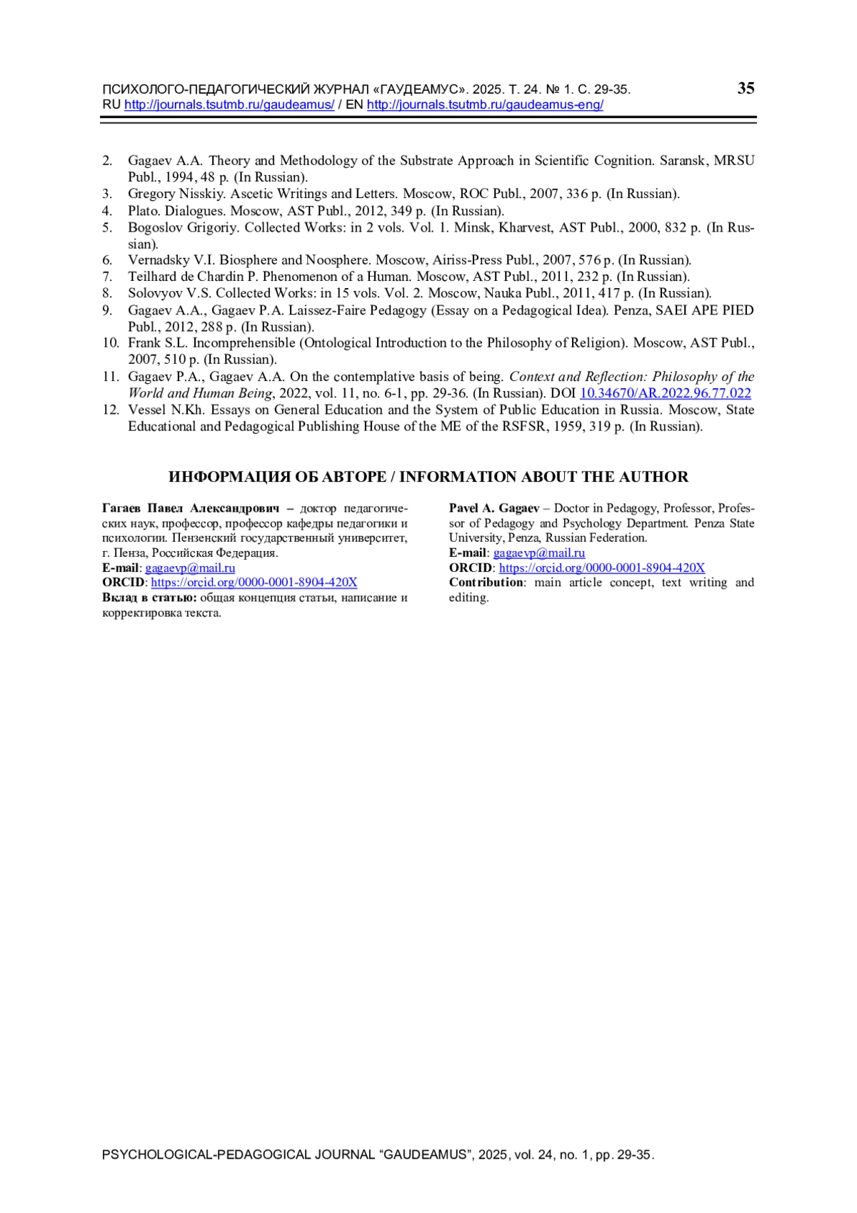 11. Гагаев А.А., Гагаев П.А. О созерцательной основе бытия человека // Контекст и рефлексия: философия о мире и человеке. 2022. Т. 11. № 6-1. С. 29-36. ;. DOI: 10.34670/AR.2022.96.77.022