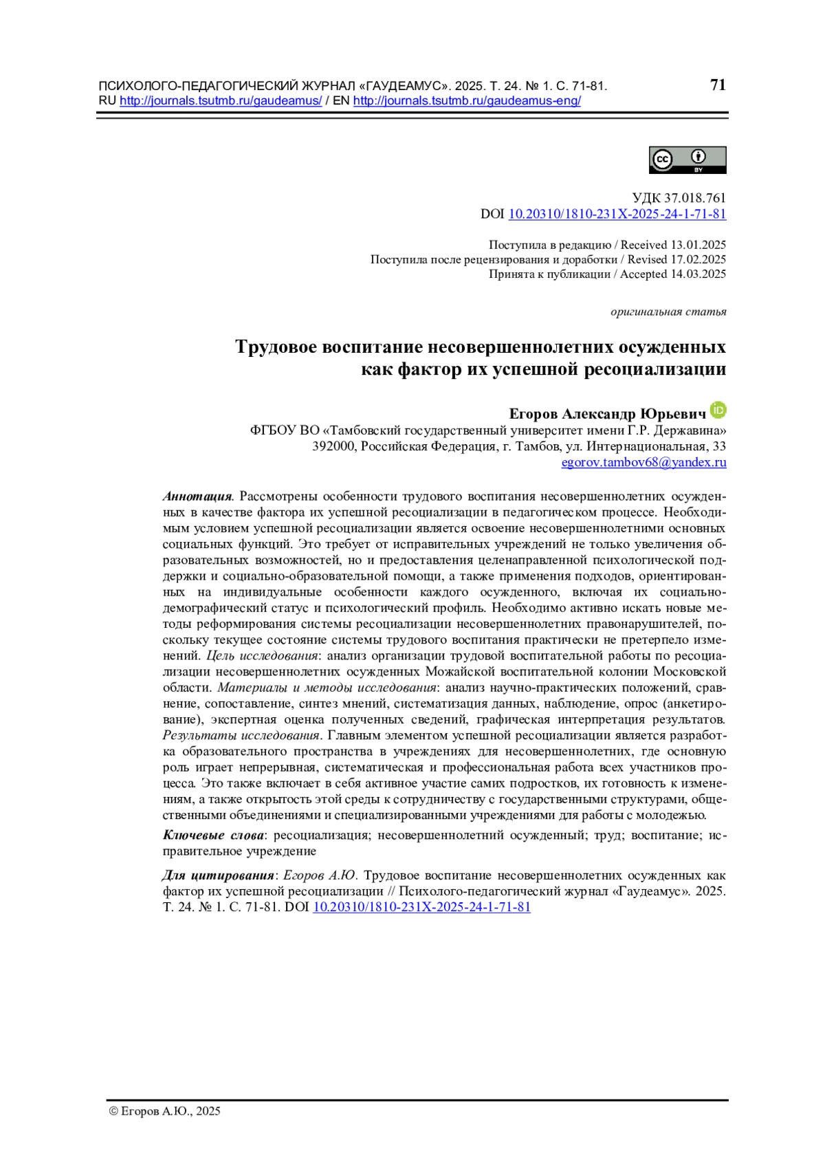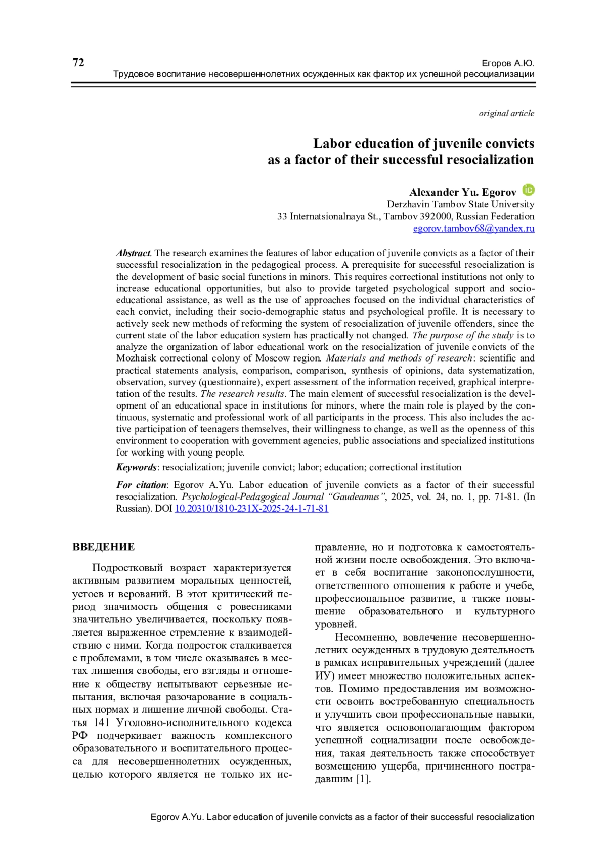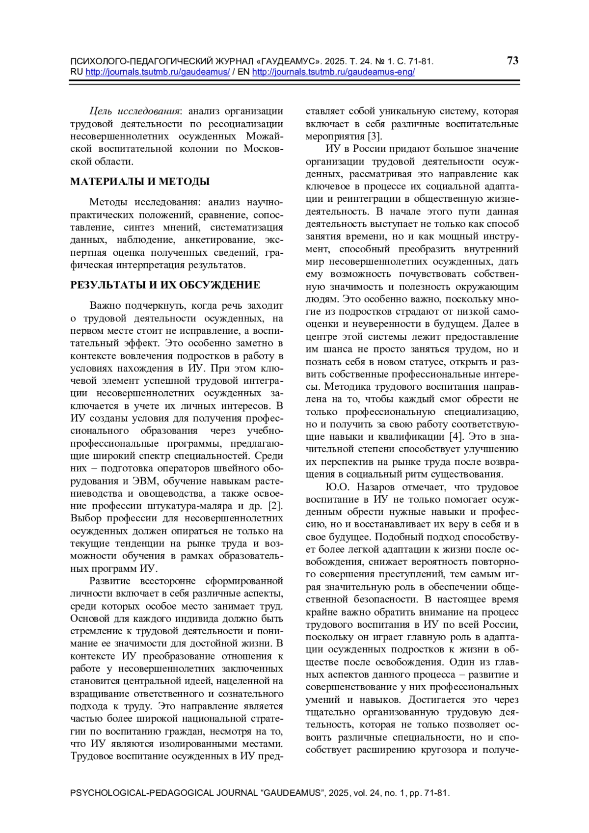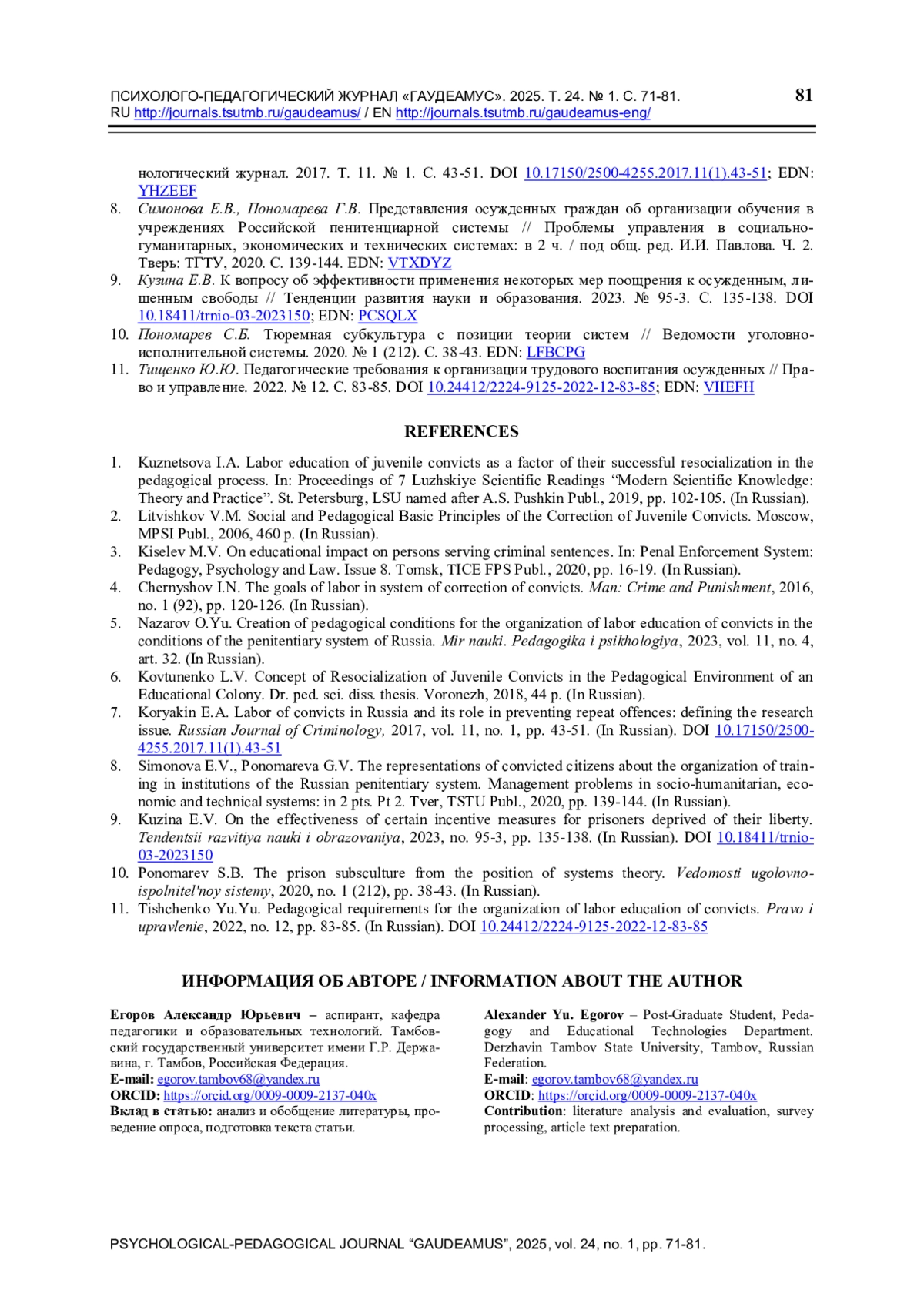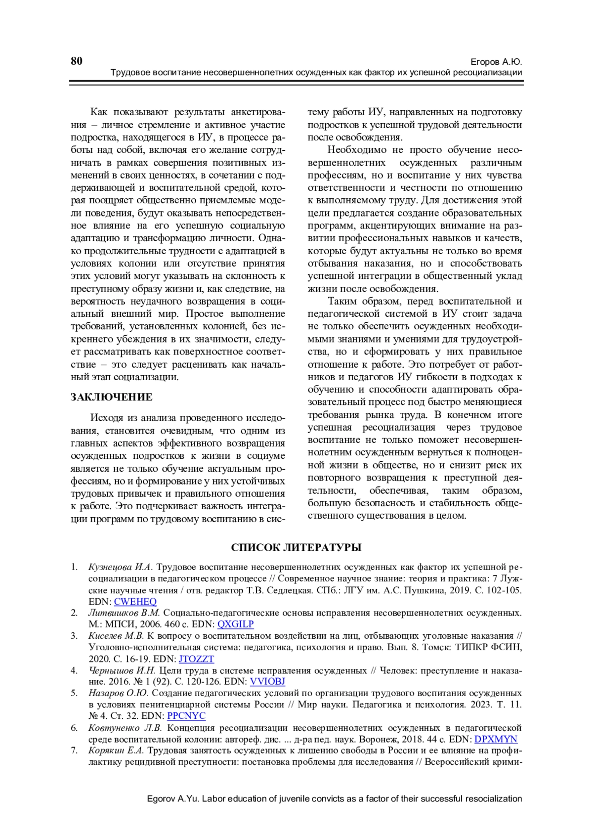 5. Назаров О.Ю. Создание педагогических условий по организации трудового воспитания осужденных в условиях пенитенциарной системы России // Мир науки. Педагогика и психология. 2023. Т. 11. № 4. Ст. 32.