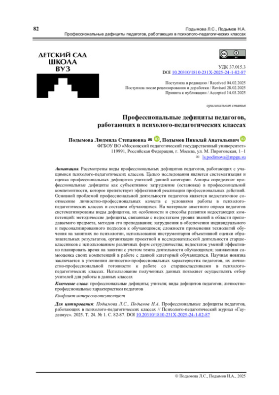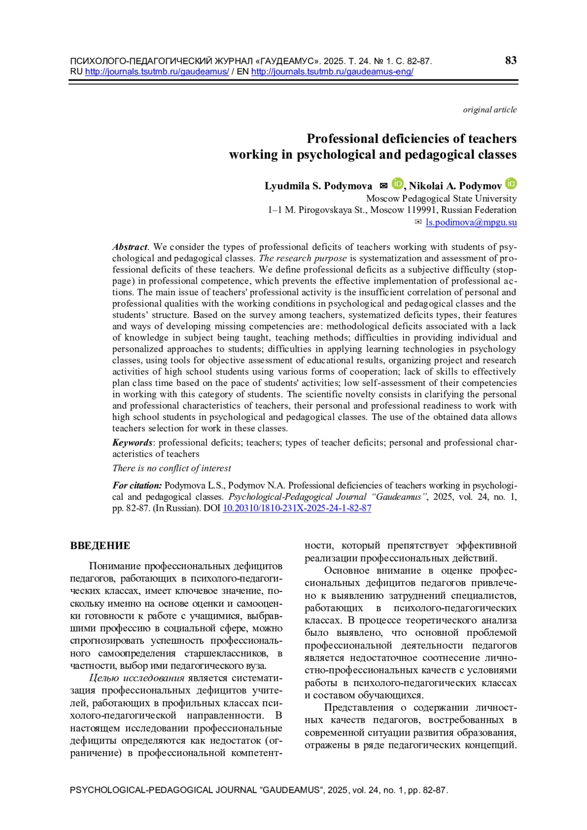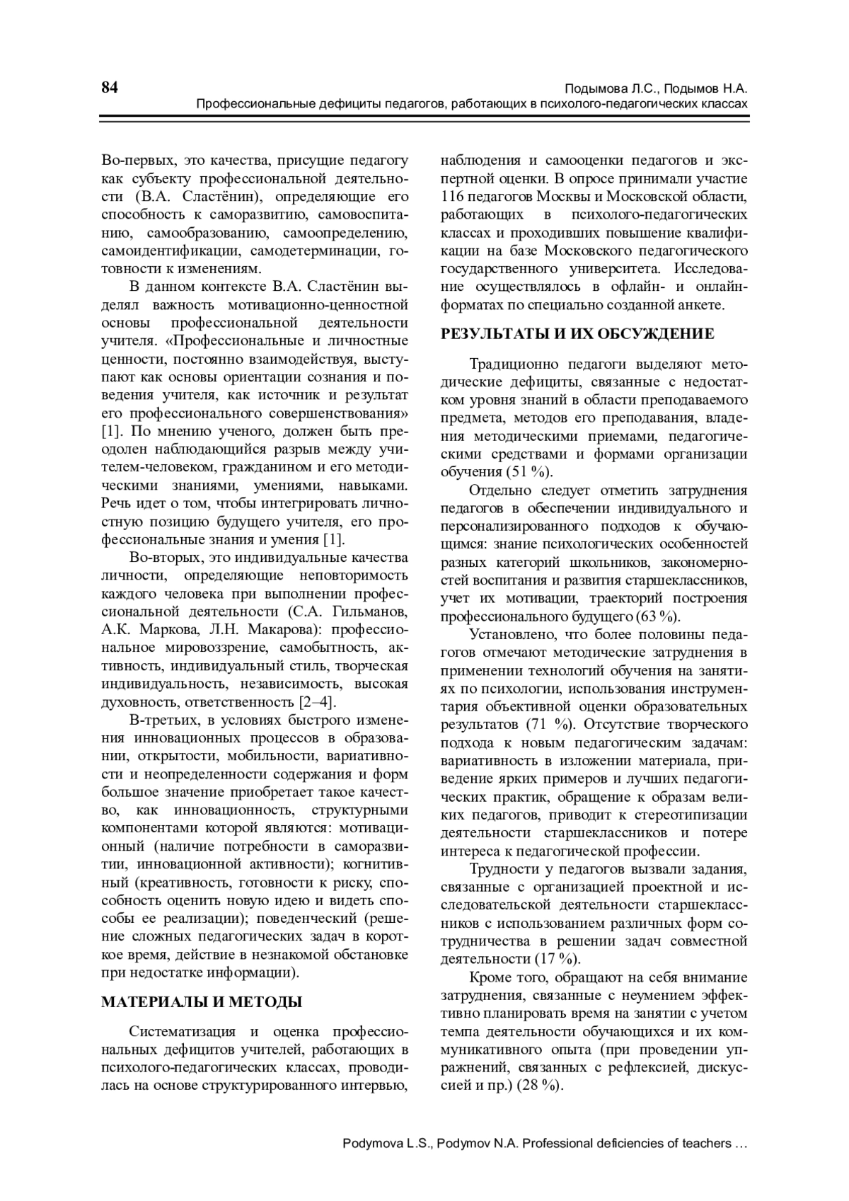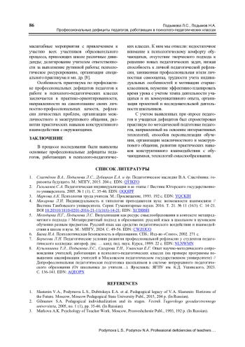 Рассмотрены виды профессиональных дефицитов педагогов, работающих с учащимися психолого-педагогических классов. Целью исследования является систематизация и оценка профессиональных дефицитов учителей данной категории. Авторы определяют профессиональные дефициты как субъективное затруднение (остановка) в профессиональной компетентности, которое препятствует эффективной реализации профессиональных действий. Основной проблемой профессиональной деятельности педагогов является недостаточное соотнесение личностно-профессиональных качеств с условиями работы в психолого-педагогических классах и составом обучающихся. На материале анкетного опроса педагогов систематизированы виды дефицитов, их особенности и способы развития недостающих компетенций: методические дефициты, связанные с недостатком уровня знаний в области преподаваемого предмета, методов его преподавания; затруднения в обеспечении индивидуального и персонализированного подходов к обучающимся; сложности применения технологий обучения на занятиях по психологии, использования инструментария объективной оценки образовательных результатов, организации проектной и исследовательской деятельности старшеклассников с использованием различных форм сотрудничества; недостаток умений эффективно планировать время на занятии с учетом темпа деятельности обучающихся; заниженная самооценка своих компетенций в работе с данной категорией обучающихся. Научная новизна заключается в уточнении личностно-профессиональных характеристик педагогов, их личностно-профессиональной готовности к работе со старшеклассниками в психолого-педагогических классах. Использование полученных данных позволяет осуществлять отбор учителей для работы в данных классах
