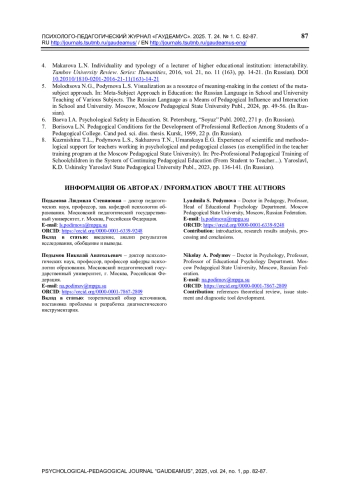 5. Молодцова Н.Г., Подымова Л.С. Визуализация как ресурс смыслообразования в контексте метапредметного подхода // Метапредметный подход в образовании: русский язык в школьном и вузовском обучении разным предметам. Русский язык как средство педагогического воздействия и взаимодействия в школе и вузе. М.: МПГУ, 2024. С. 49-56.