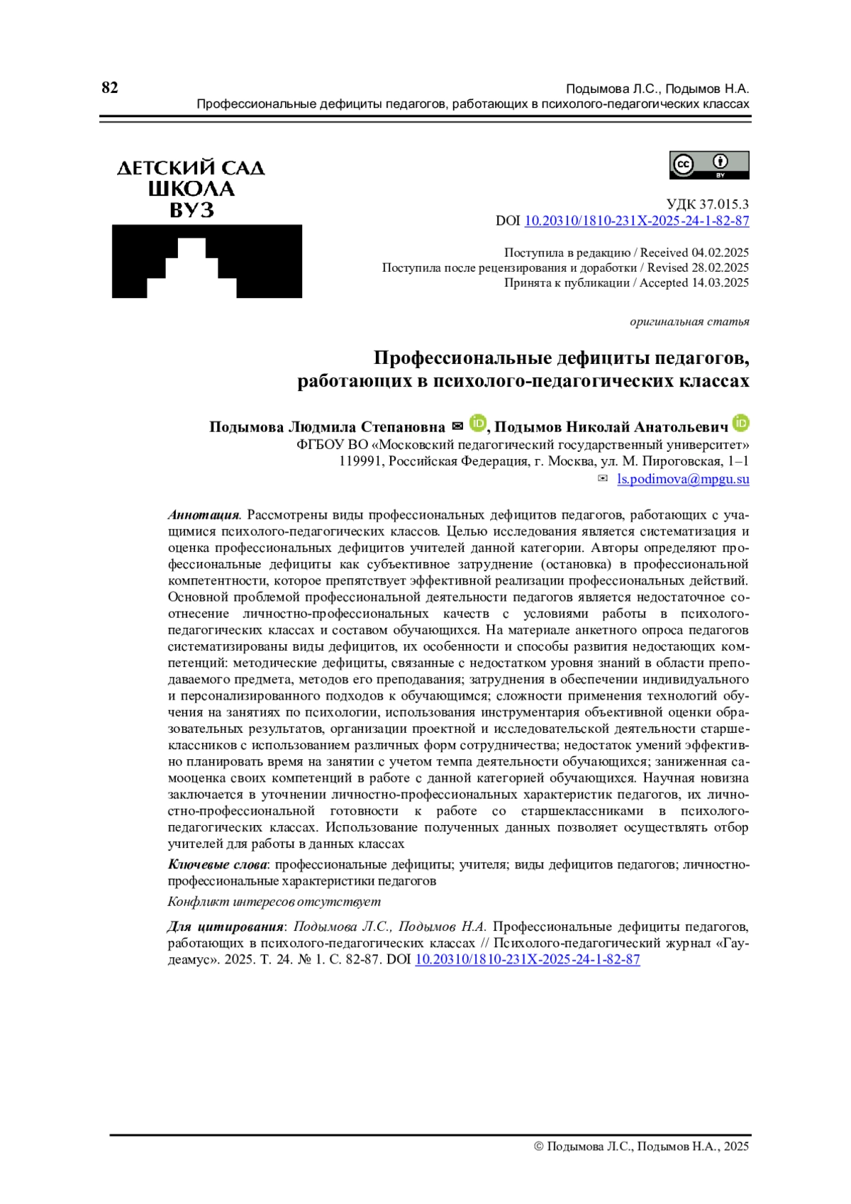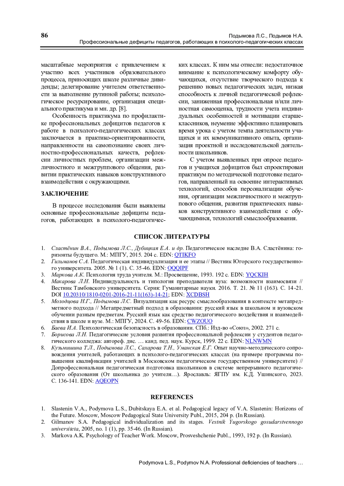 8. Кузьмишина Т.Л., Подымова Л.С., Сахарова Т.Н., Уманская Е.Г. Опыт научно-методического сопровождения учителей, работающих в психолого-педагогических классах (на примере программы повышения квалификации учителей в Московском педагогическом государственном университете) // Допрофессиональная педагогическая подготовка школьников в системе непрерывного педагогического образования (От школьника до учителя…). Ярославль: ЯГПУ им. К.Д. Ушинского, 2023. С. 136-141.