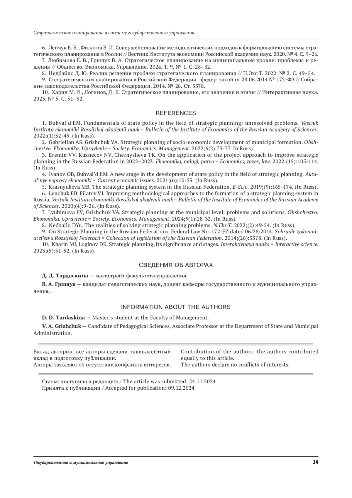 7. Любимова Е. В., Грищук В. А. Стратегическое планирование на муниципальном уровне: проблемы и решения // Общество. Экономика. Управление. 2024. Т. 9, № 1. С. 28-32. EDN: KMUIVO