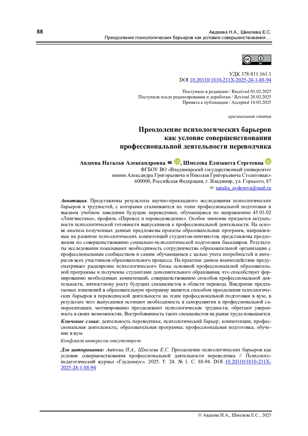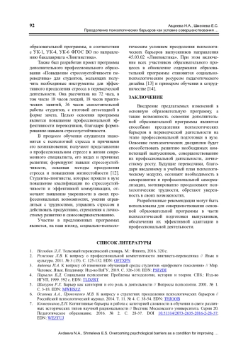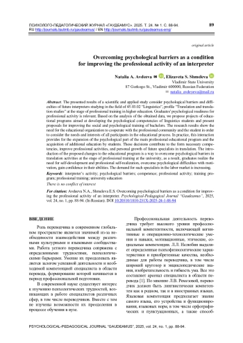 Представлены результаты научно-прикладного исследования психологических барьеров и трудностей, с которыми сталкиваются на этапе профессиональной подготовки в высшем учебном заведении будущие переводчики, обучающиеся по направлению 45.03.02 «Лингвистика», профиль «Перевод и переводоведение». Особое значение придается актуальности психологической готовности выпускников к профессиональной деятельности. На основе анализа полученных данных предложены проекты образовательных программ, направленные на развитие психологических компетенций студентов-лингвистов, представлены предложения по совершенствованию социально-психологической подготовки бакалавров. Результаты исследования показывают необходимость сотрудничества образовательной организации с профессиональным сообществом и самим обучающимся с целью учета потребностей и интересов всех участников образовательного процесса. На практике данное взаимодействие предусматривает расширение психологического блока основной профессиональной образовательной программы и получение студентами дополнительного образования, что способствует формированию необходимых компетенций, совершенствованию способов профессиональной деятельности, личностному росту будущих специалистов в области перевода. Внедрение предлагаемых изменений в образовательную программу является способом преодоления психологических барьеров в переводческой деятельности на этапе профессиональной подготовки в вузе, в результате чего выпускники осознают необходимость в саморазвитии и профессиональной самореализации, мотивированно преодолевают психологические трудности, обретают уверенность в своих возможностях. Востребованность таких специалистов на рынке труда повышается.