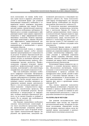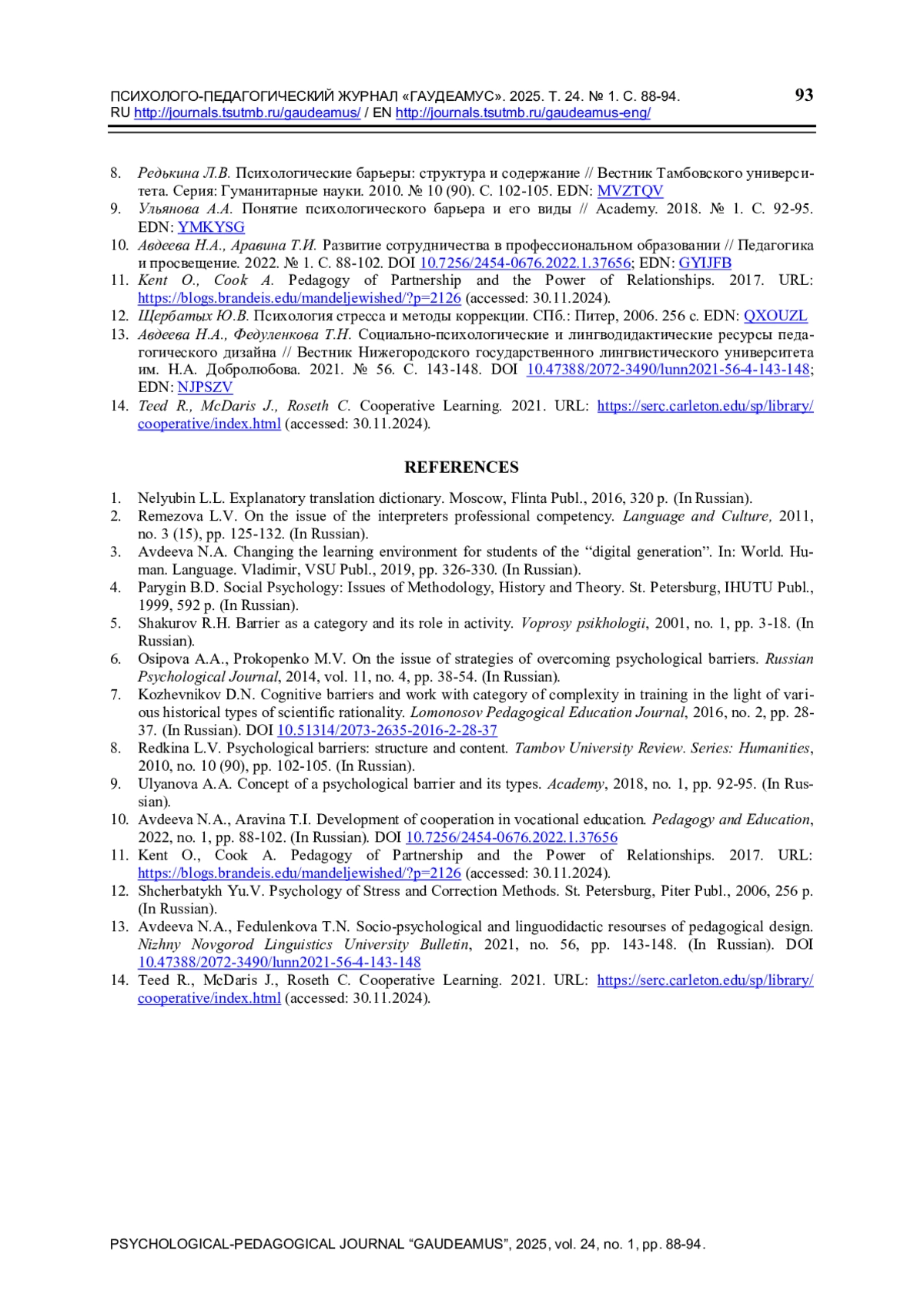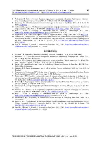 8. Редькина Л.В. Психологические барьеры: структура и содержание // Вестник Тамбовского университета. Серия: Гуманитарные науки. 2010. № 10 (90). С. 102-105.
