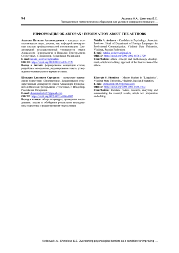 Цель исследования - изучение и анализ причин возникновения и влияния эмоциональных, социальных и коммуникативных факторов на возникновение барьеров общения у преподавателей, работающих с иностранными обучающимися. Проведено эмпирическое исследование, участниками которого являлись 58 преподавателей Московского педагогического государственного университета, ведущие разные учебные дисциплины у иностранных студентов. Были использованы авторский опросник выраженности эмоциональных и социальных барьеров в профессиональной деятельности преподавателей, «Опросник коммуникативной толерантности» В. В. Бойко. Установлено, что у преподавателей вузов чаще других возникают следующие виды психологических барьеров во взаимодействии с иностранными студентами: стремление переделать, перевоспитать обучающихся, неумение прощать ошибки, неловкость, непреднамеренное причинение неприятностей, категоричность и консерватизм в оценках личности обучающегося, неумение скрывать или сглаживать неприятные чувства при столкновении с некоммуникабельными качествами студентов. Представлен анализ выраженности компонентов коммуникативной толерантности педагогов, их готовности поддерживать студентов во время занятий, умение приспосабливаться к работе с ними, преодоление консерватизма. Рассмотрена программа-тренинг преодоления психологических барьеров во взаимодействии преподавателей с иностранными студентами, включающая диагностический, практический и аналитический этапы. В процессе тренинга разбираются кейсы, в которых представлены примеры того, как высокий уровень коммуникативной компетентности вносит значительный вклад в достижение целей. Научная новизна заключается в систематизации представлений о видах психологических барьеров в общении преподавателей с иностранными обучающимися и способах их преодоления.