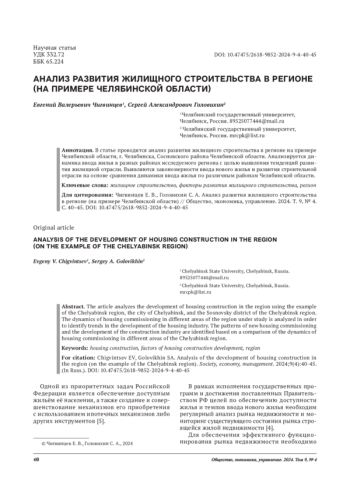 8. Чигвинцев Е. В. Анализ сравнения развития жилого строительства Челябинской области и Уральского федерального округа // Научное пространство современной молодёжи: приоритетные задачи и инновационные решения: сб. статей участников IV Всерос. молод. науч.- практ. конф. Челябинск, 2023. С. 283-285. EDN: IGQOXV