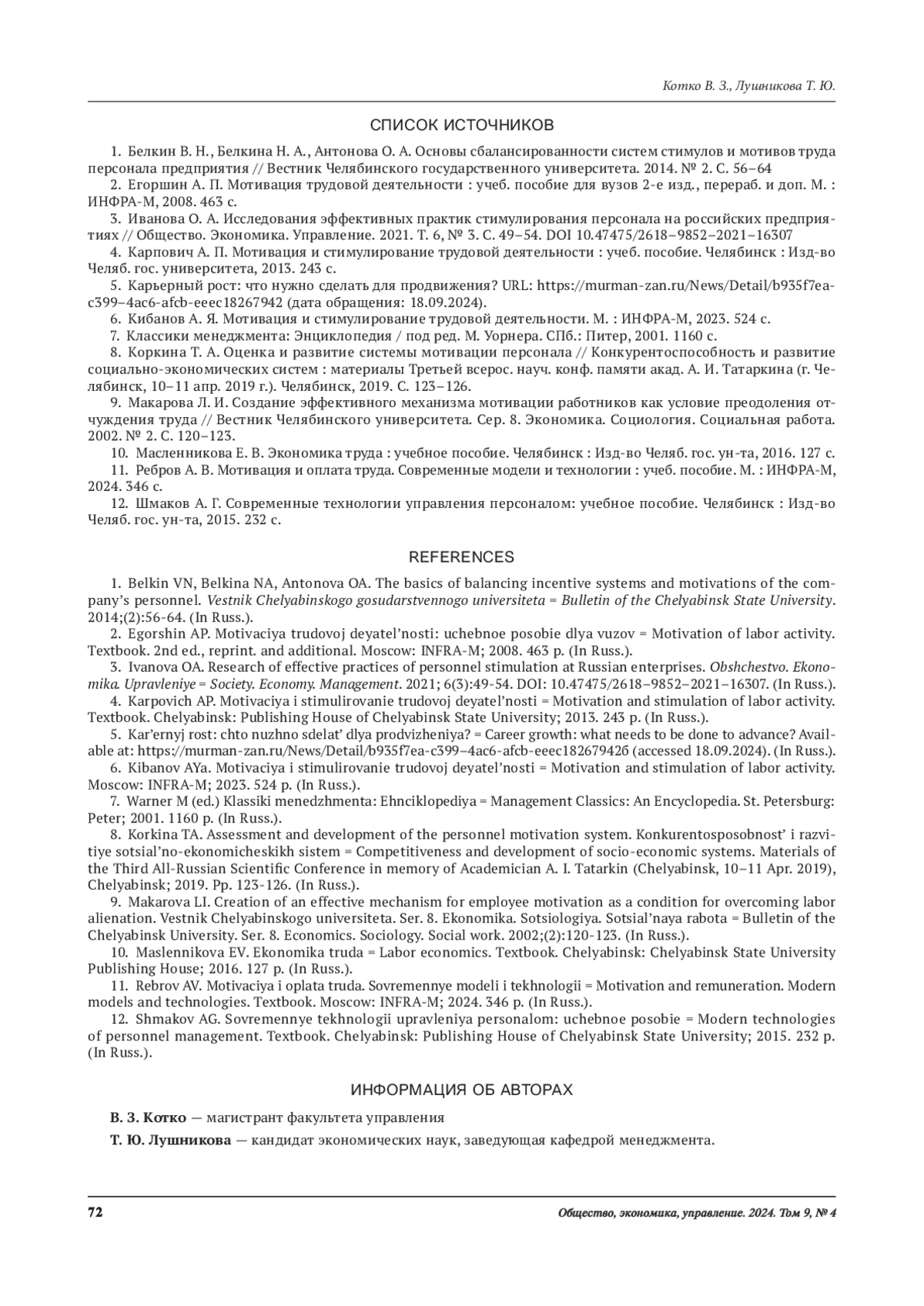 ЛУШНИКОВА Т. Ю., КОТКО В. З. МОТИВАЦИЯ ТРУДА РАБОТНИКОВ БИБЛИОТЕКИ: РОЛЬ НЕМАТЕРИАЛЬНЫХ МЕТОДОВ // ОБЩЕСТВО, ЭКОНОМИКА, УПРАВЛЕНИЕ. 2024. Т. 9 № 4