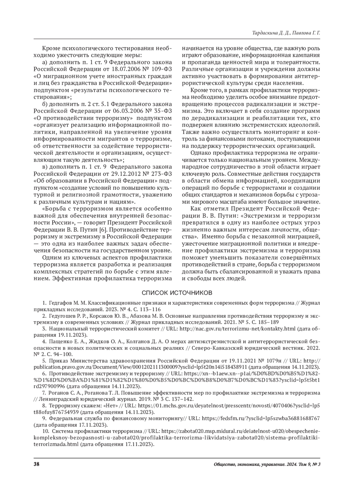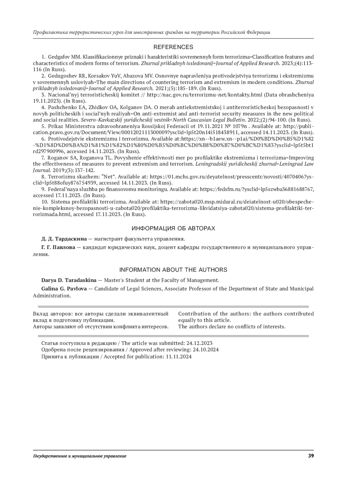 ПАВЛОВА Г. Г., ТАРДАСКИНА Д. Д. ПРОФИЛАКТИКА ТЕРРОРИСТИЧЕСКИХ УГРОЗ ДЛЯ ИНОСТРАННЫХ ГРАЖДАН НА ТЕРРИТОРИИ РОССИЙСКОЙ ФЕДЕРАЦИИ // ОБЩЕСТВО, ЭКОНОМИКА, УПРАВЛЕНИЕ. 2024. Т. 9 № 3
