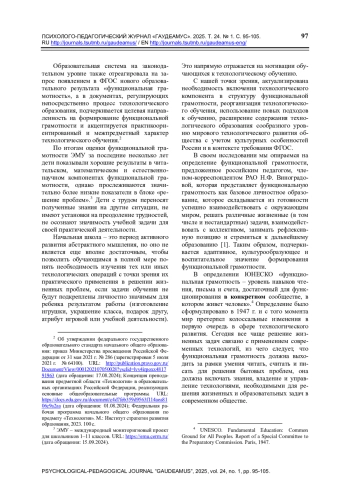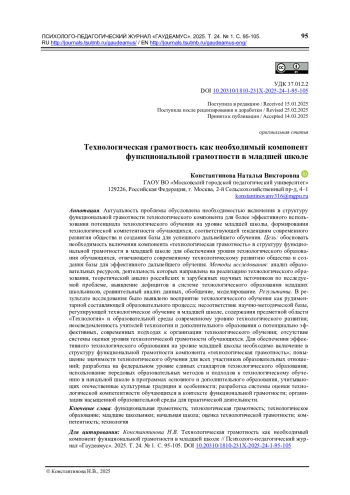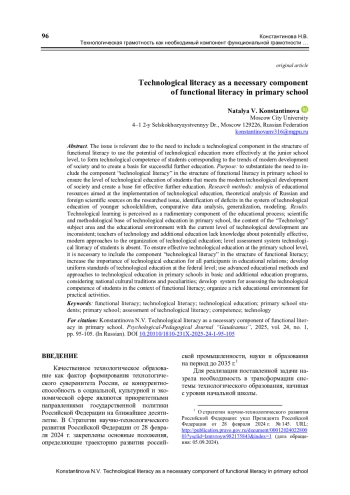 Актуальность проблемы обусловлена необходимостью включения в структуру функциональной грамотности технологического компонента для более эффективного использования потенциала технологического обучения на уровне младшей школы, формирования технологической компетентности обучающихся, соответствующей тенденциям современного развития общества и создания базы для успешного дальнейшего обучения. Цель: обосновать необходимость включения компонента «технологическая грамотность» в структуру функциональной грамотности в младшей школе для обеспечения уровня технологического образования обучающихся, отвечающего современному технологическому развитию общества и создания базы для эффективного дальнейшего обучения. Методы исследования: анализ образовательных ресурсов, деятельность которых направлена на реализацию технологического образования, теоретический анализ российских и зарубежных научных источников по исследуемой проблеме, выявление дефицитов в системе технологического образования младших школьников, сравнительный анализ данных, обобщение, моделирование. Результаты. В результате исследования было выявлено восприятие технологического обучения как рудиментарной составляющей образовательного процесса; несоответствие научно-методической базы, регулирующей технологическое обучение в младшей школе, содержания предметной области «Технология» и образовательной среды современному уровню технологического развития; неосведомленность учителей технологии и дополнительного образования о потенциально эффективных, современных подходах к организации технологического обучения; отсутствие системы оценки уровня технологической грамотности обучающихся. Для обеспечения эффективного технологического образования на уровне младшей школы необходимо включение в структуру функциональной грамотности компонента «технологическая грамотность»; повышение значимости технологического обучения для всех участников образовательных отношений; разработка на федеральном уровне единых стандартов технологического образования; использование передовых образовательных методов и подходов к технологическому обучению в начальной школе в программах основного и дополнительного образования, учитывающих отечественные культурные традиции и особенности; разработка системы оценки технологической компетентности обучающихся в контексте функциональной грамотности; организация насыщенной образовательной среды для практической деятельности.
