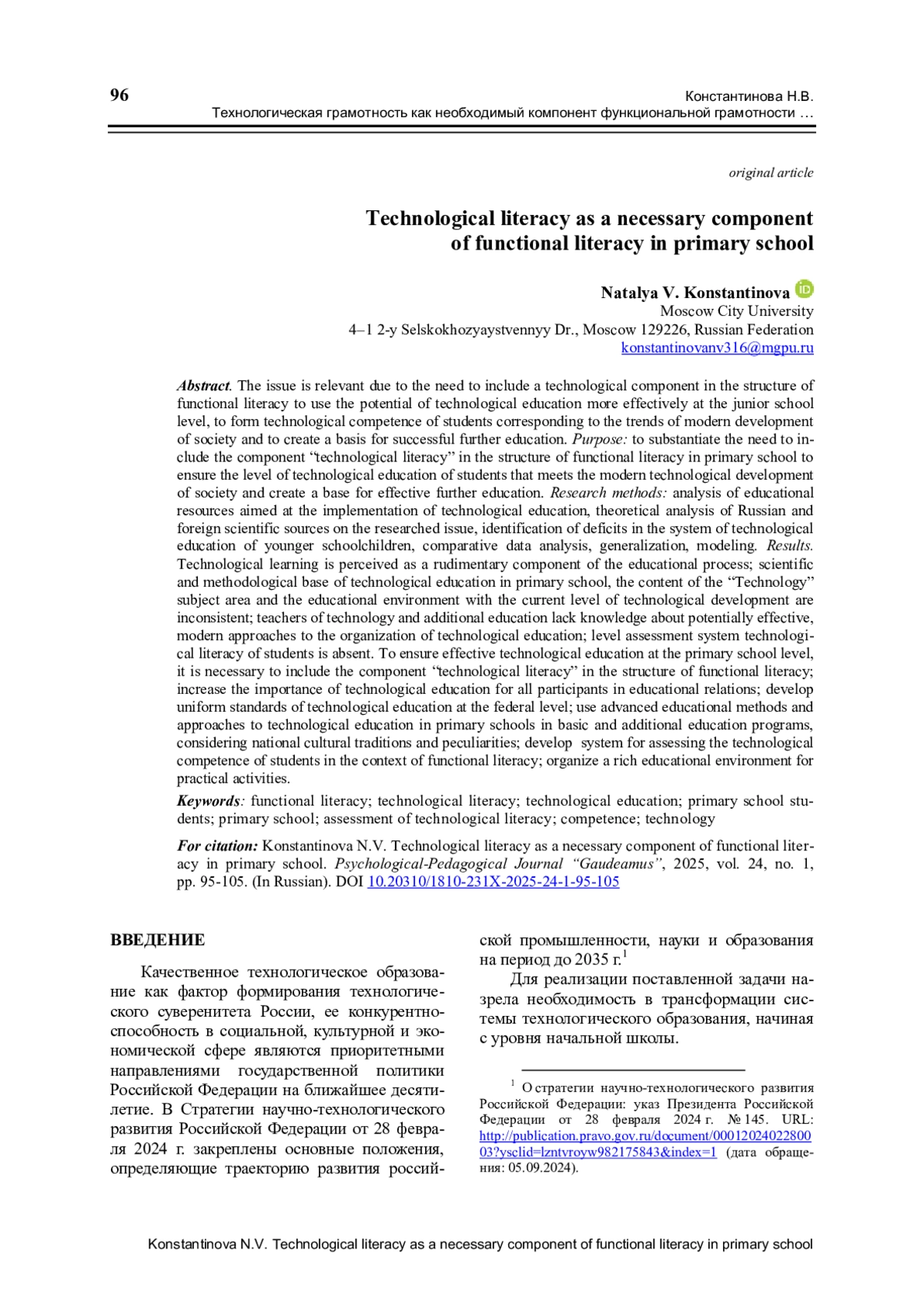 Качественное технологическое образование как фактор формирования технологического суверенитета России, ее конкурентно-способность в социальной, культурной и экономической сфере являются приоритетными направлениями государственной политики Российской Федерации на ближайшее десятилетие. В Стратегии научно-технологического развития Российской Федерации от 28 февраля 2024 г. закреплены основные положения, определяющие траекторию развития российской промышленности, науки и образования на период до 2035 г