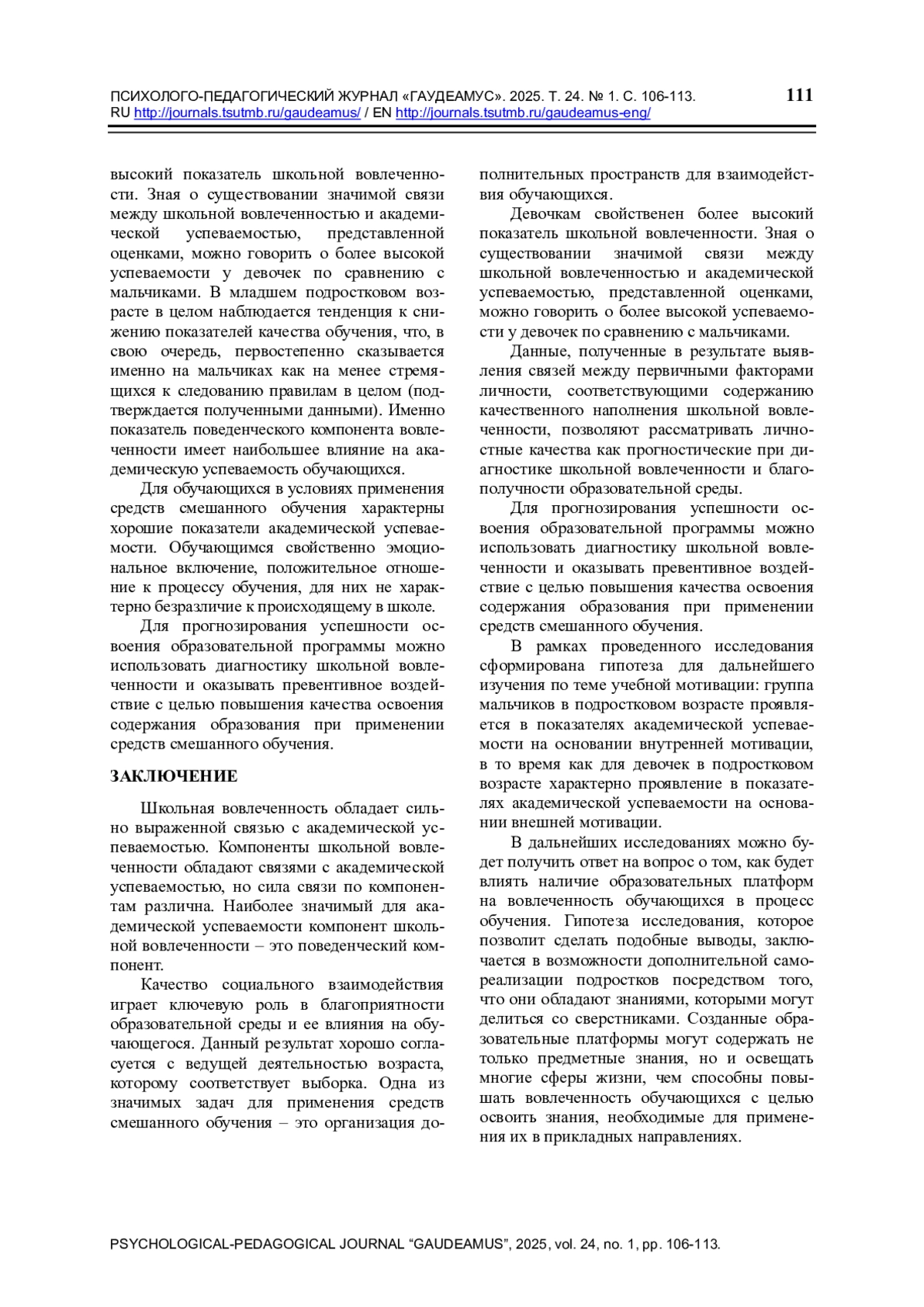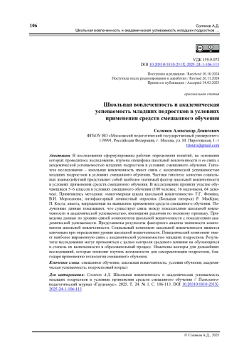 На успешность реализации образовательного процесса влияет множество различных факторов. Часть факторов, влияющих на эффективность обучения, закладывается условиями образовательного процесса. Например, к таким факторам можно отнести форму, технологии и методы обучения. Однако существуют факторы, которые происходят из особенностей и характеристик обучающихся, например, учебная мотивация. По мере изучения механизмов, лежащих в основе образовательного процесса, был сформулирован термин «школьная вовлеченность», отражающий, как мотивация обучающегося сочетается с условиями образовательной среды, в которой он находится. Термин определяется как «устойчивое, направленное, активное участие обучающихся в школьной жизни, которое связано с проявлениями на поведенческом, эмоциональном, когнитивном и социальном уровнях» [1]. Таким образом, новые возможности изучения средовой составляющей академической успеваемости открываются благодаря школьной вовлеченности. Целью исследования послужило изучение специфики школьной вовлеченности и ее связи с академической успеваемостью младших подростков в условиях применения средств смешанного обучения. Широкий спектр определений, которые кроются за термином «смешанное обучение», поднимает вопрос о границах применения смешанного обучения и отдельных методов, которые ему присущи.