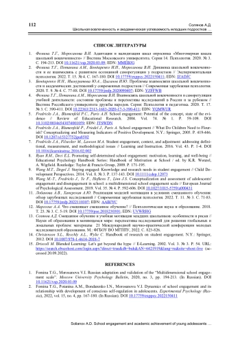 3. Бондаренко И.Н., Ишмуратова Ю.А., Цыганов И.Ю. Проблемы взаимосвязи школьной вовлеченности и академических достижений у современных подростков // Современная зарубежная психология. 2020. Т. 9. № 4. С. 77-88. ;. DOI: 10.17759/jmfp.2020090407