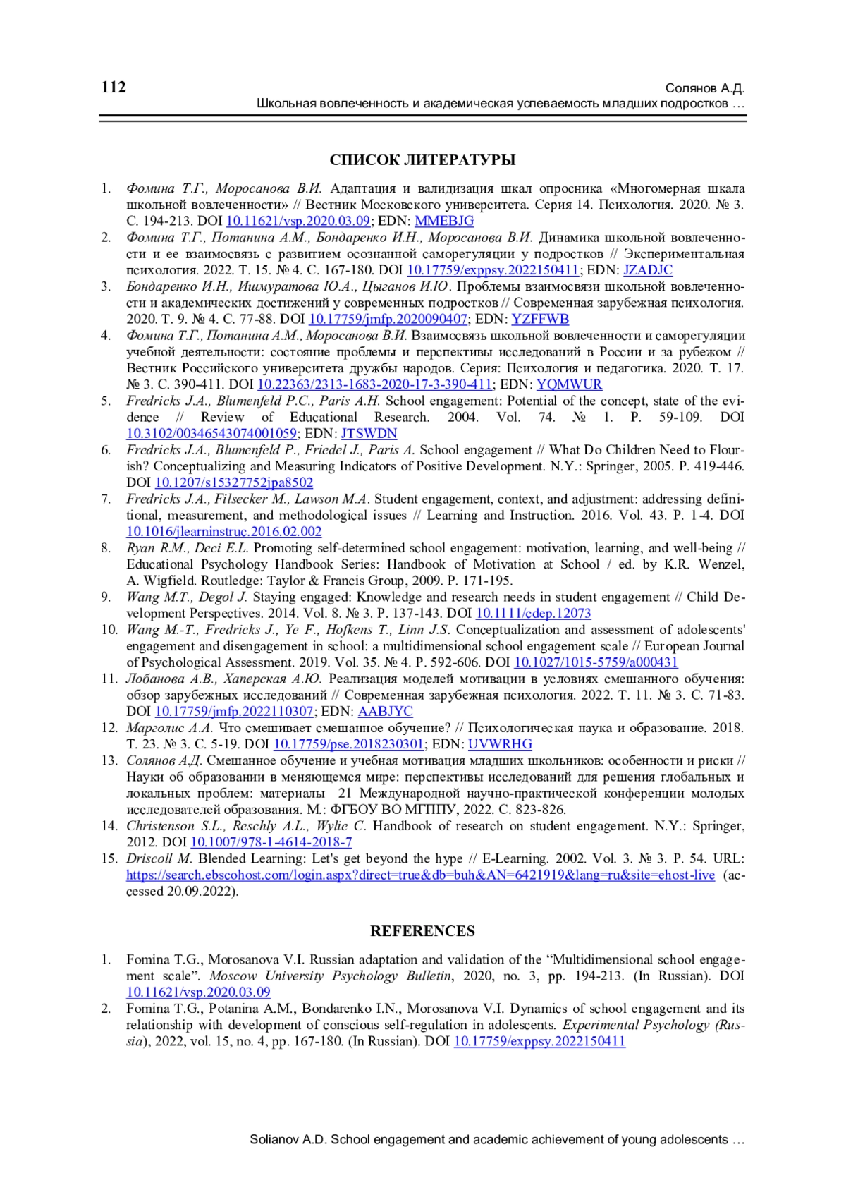 1. Фомина Т.Г., Моросанова В.И. Адаптация и валидизация шкал опросника “Многомерная шкала школьной вовлеченности” // Вестник Московского университета. Серия 14. Психология. 2020. № 3. С. 194-213. ;. DOI: 10.11621/vsp.2020.03.09