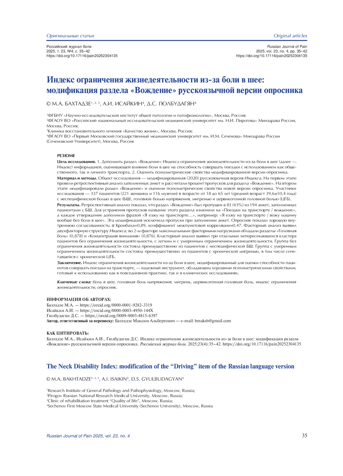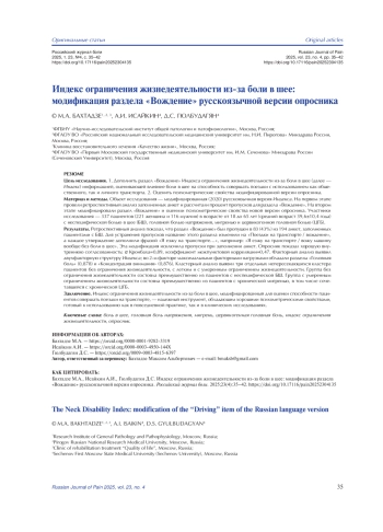 Заключение. Индекс ограничения жизнедеятельности из-за боли в шее, модифицированный для оценки способности пациентов совершать поездки на транспорте, — надежный инструмент, обладающим хорошими психометрическими свойствами, готовый к использованию как в повседневной практике, так и в клинических исследованиях.