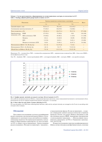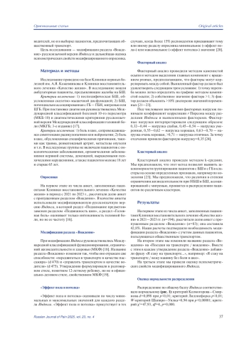 Результаты. Ретроспективный анализ показал, что раздел «Вождение» был пропущен в 83 (43%) из 194 анкет, заполненных пациентами с БШ. Для устранения пропусков название этого раздела изменили на «Поездки на транспорте / вождение», а каждое утверждение дополнили фразой «Я езжу на транспорте…», например: «Я езжу на транспорте / вожу машину вообще без боли в шее». Эта модификация исключила пропуски при заполнении анкет. Опросник показал хорошую внутреннюю согласованность: α Кронбаха=0,89, коэффициент межпунктовой корреляции=0,47. Факторный анализ выявил двухфакторную структуру Индекса; во 2-м факторе максимальными факторными нагрузками обладали разделы «Головная боль» (0,878) и «Концентрация внимания» (0,876). Кластерный анализ выявил три отдельных непересекающихся кластера пациентов без ограничения жизнедеятельности, с легким и с умеренным ограничением жизнедеятельности. Группа без ограничения жизнедеятельности состояла преимущественно из пациентов с неспецифической БШ. Группа с умеренным ограничением жизнедеятельности состояла преимущественно из пациентов с хронической мигренью, в том числе сочетавшейся с хронической ЦГБ.