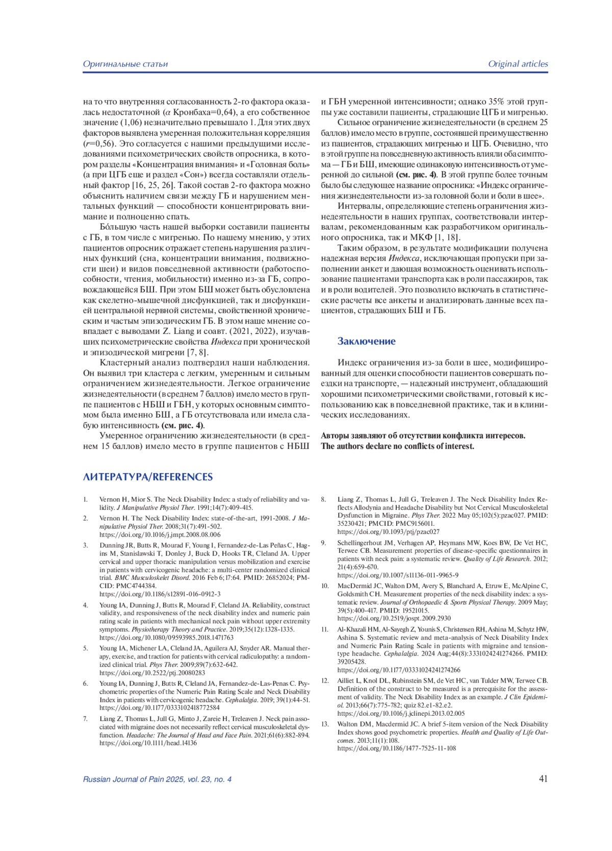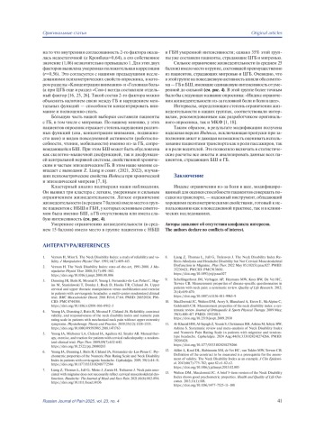 16. Бахтадзе М.А., Проскуряков К.В., Лусникова И.В. Индекс ограничения жизнедеятельности из-за боли в шее: модификация русскоязычной версии опросника. Российский журнал боли. 2020;18(3):54-60. DOI: 10.17116/pain20201803154