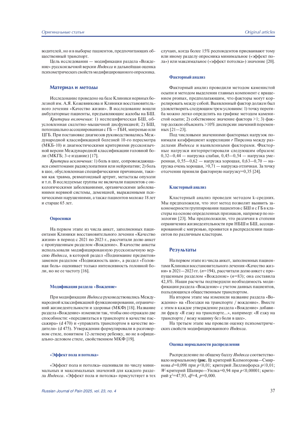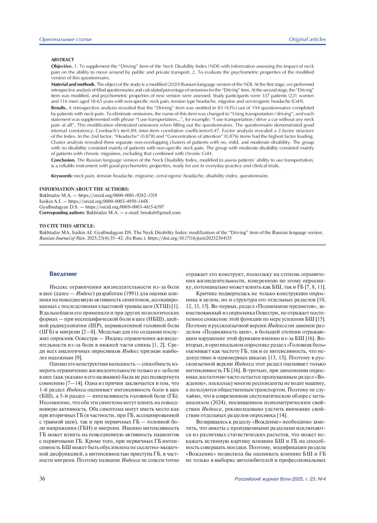 Материал и методы. Объект исследования — модифицированная (2020) русскоязычная версия Индекса. На первом этапе провели ретроспективный анализ заполненных анкет и рассчитали процент пропусков для раздела «Вождение». На втором этапе модифицировали раздел «Вождение» и оценили психометрические свойства новой версии опросника. Участники исследования — 337 пациентов (221 женщина и 116 мужчин) в возрасте от 18 до 65 лет (средний возраст 39,6±10,4 года) с неспецифической болью в шее (БШ), головной болью напряжения, мигренью и цервикогенной головной болью (ЦГБ).