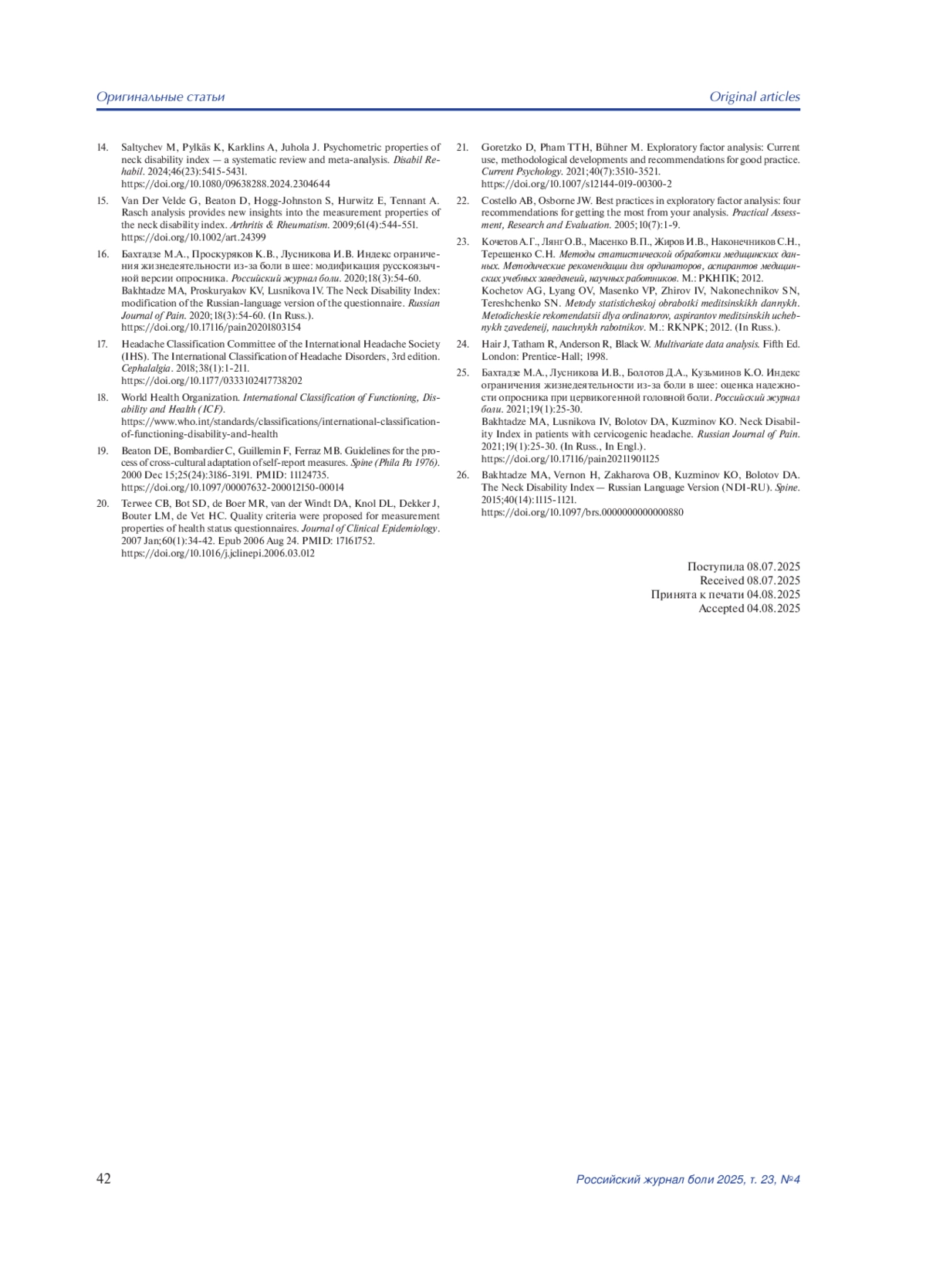 25. Бахтадзе М.А., Лусникова И.В., Болотов Д.А., Кузьминов К.О. Индекс ограничения жизнедеятельности из-за боли в шее: оценка надежности опросника при цервикогенной головной боли. Российский журнал боли. 2021;19(1):25-30. DOI: 10.17116/pain20211901125
