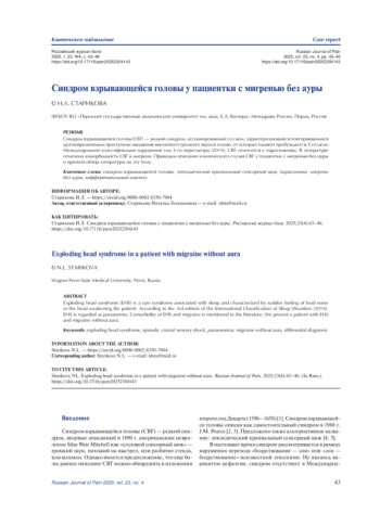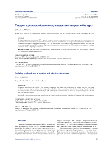 Синдром взрывающейся головы (СВГ) — редкий синдром, ассоциированный со сном, характеризующийся повторяющимися кратковременными приступами ощущения внезапного громкого звука в голове, от которых пациент пробуждается. Согласно Международной классификации нарушений сна 3-го пересмотра (2014), СВГ относится к парасомниям. В литературе отмечена коморбидность СВГ и мигрени. Приводим описание клинического случая СВГ у пациентки с мигренью без ауры и краткий обзор литературы на эту тему.