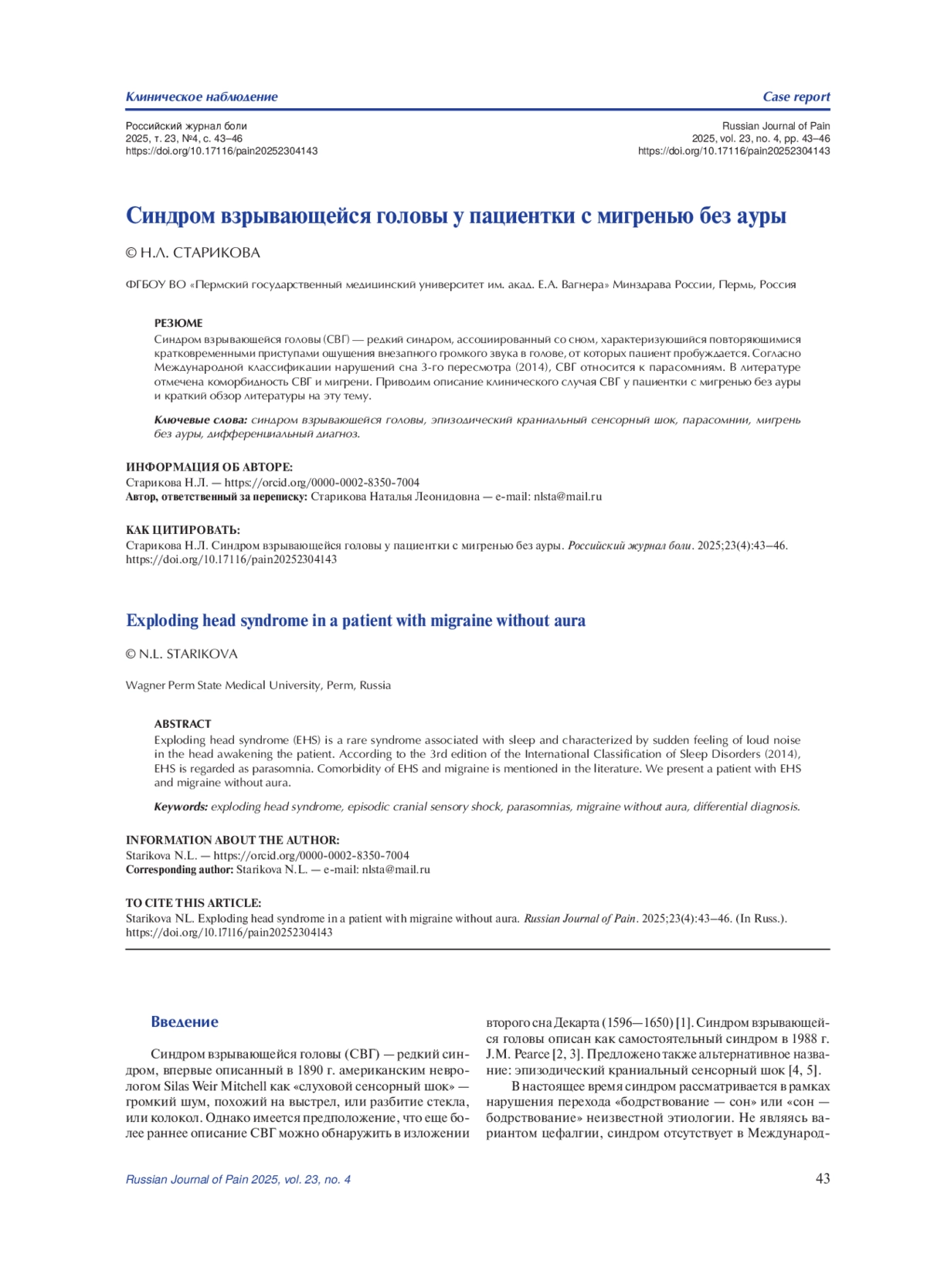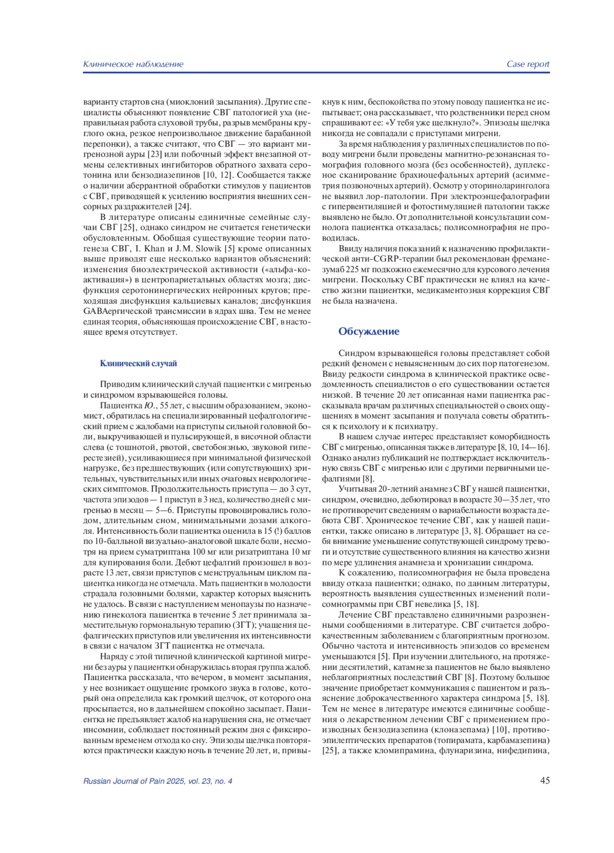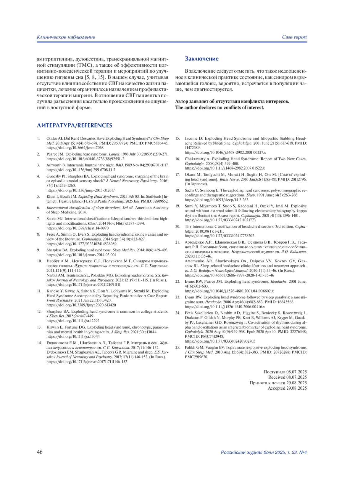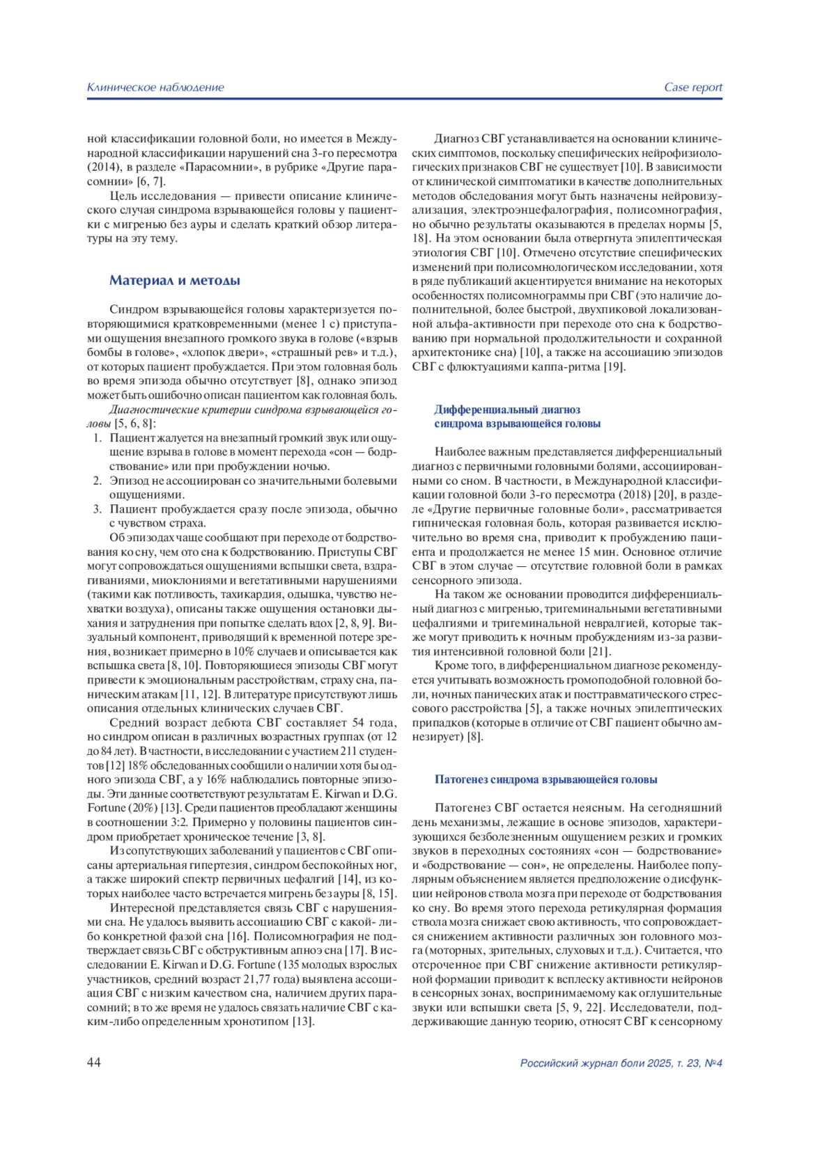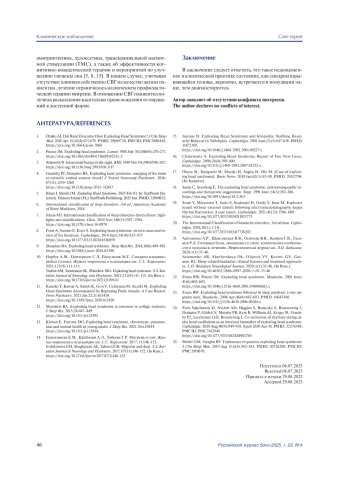 10. Нарбут А.М., Центерадзе С.Л, Полуэктов М.Г. Синдром взрывающейся головы. Журнал неврологии и психиатрии им. С.С. Корсакова. 2021;121(9):111-115. DOI: 10.17116/jnevro2021121091111