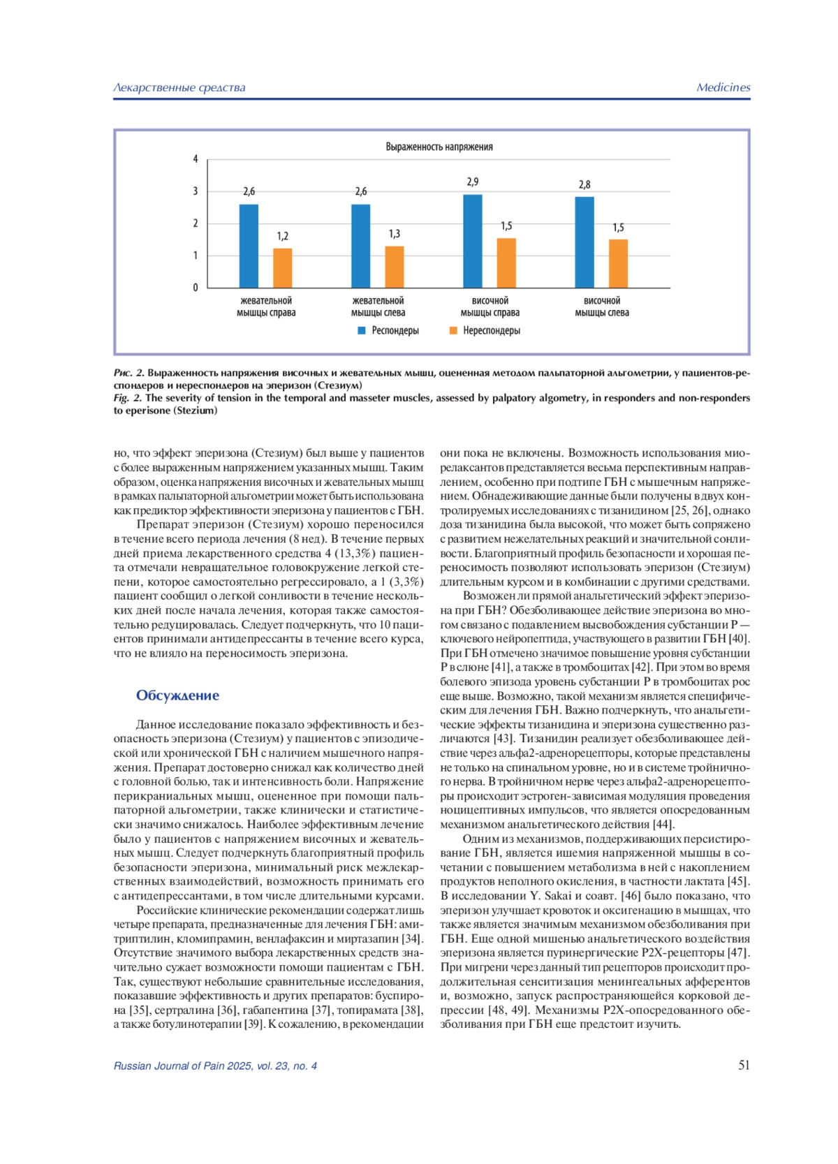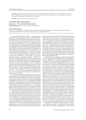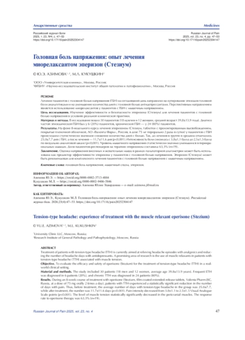 Заключение. Оценка напряжения височных и жевательных мышц в рамках пальпаторной альгометрии может быть использована как предиктор эффективности эперизона у пациентов с головной болью напряжения. Эперизон (Стезиум) может быть рекомендован для комплексного лечения пациентов с головной болью напряжения с мышечным напряжением.