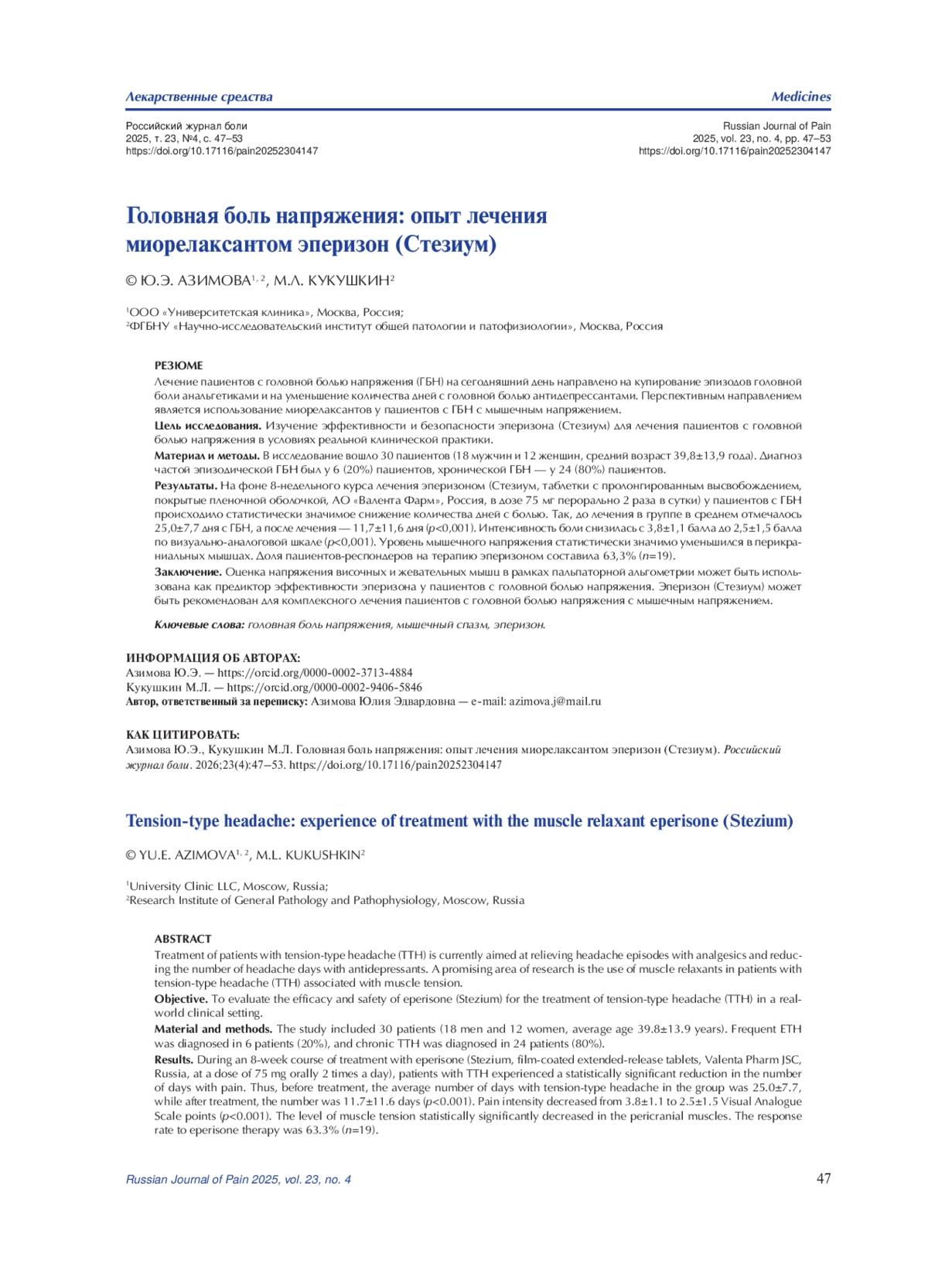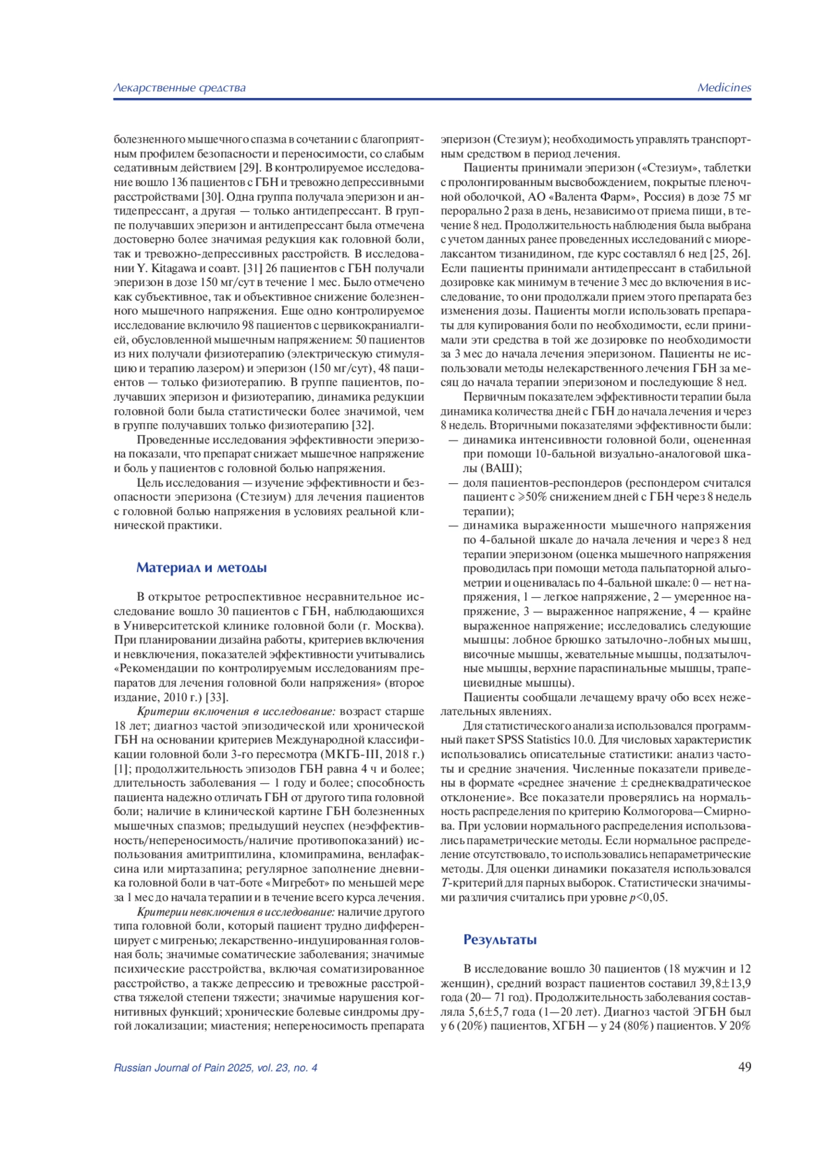 Цель исследования. Изучение эффективности и безопасности эперизона (Стезиум) для лечения пациентов с головной болью напряжения в условиях реальной клинической практики.