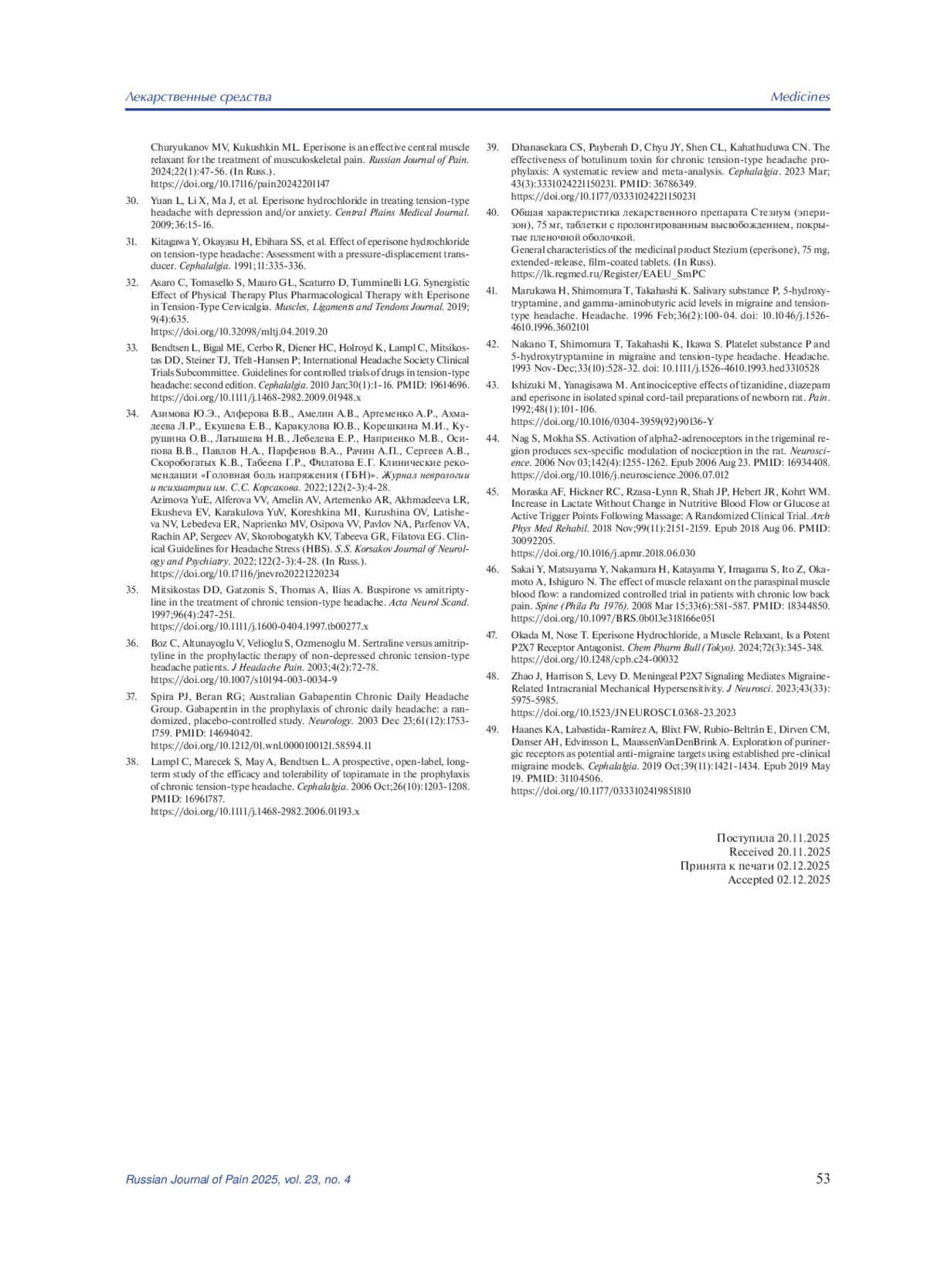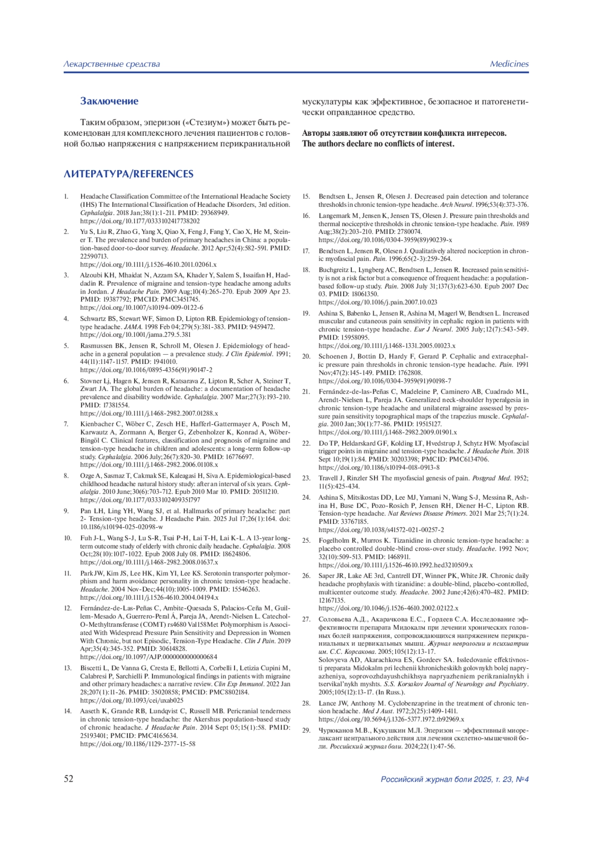 27. Соловьева А.Д., Акарачкова Е.С., Гордеев С.А. Исследование эффективности препарата Мидокалм при лечении хронических головных болей напряжения, сопровождающихся напряжением перикраниальных и цервикальных мышц. Журнал неврологии и психиатрии им. С.С. Корсакова. 2005;105(12):13-17.