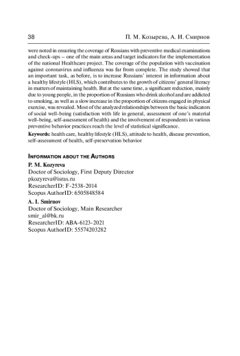 Исследование преследовало цель проанализировать в динамике отношение россиян к профилактике заболеваний и масштабы распространённости наиболее значимых практик профилактического поведения. Анализ опирается на данные Российского мониторинга экономического положения и здоровья населения НИУ ВШЭ (RLMS-HSE). В ходе исследования выявлен хорошо заметный рост ответственного отношения россиян к профилактике заболеваний. Но несмотря на это повышение, общий уровень профилактической активности граждан остаётся невысоким. Отмечены позитивные, но зачастую умеренные сдвиги в обеспечении охвата россиян профилактическими медицинскими осмотрами и диспансеризацией – одного из главных направлений и целевых показателей реализации национального проекта «Здравоохранение». Далеко не полным оказался охват населения вакцинацией против коронавируса и гриппа. Исследование показало, что важной задачей, как и прежде, является повышение интереса россиян к информации о здоровом образе жизни (ЗОЖ), способствующее росту общей грамотности граждан в вопросах сохранения здоровья. Но в то же время выявлено значительное сокращение, преимущественно за счёт людей молодого возраста, удельного веса россиян, употребляющих алкоголь и пристрастившихся к курению, а также медленный рост доли граждан, занимающихся физическими упражнениями. Большинство анализируемых связей между базовыми показателями социального самочувствия (удовлетворённость жизнью в целом, оценка своего материального благосостояния, самооценка состояния здоровья) и вовлечённостью респондентов в различные практики профилактического поведения достигают уровня статистической значимости.