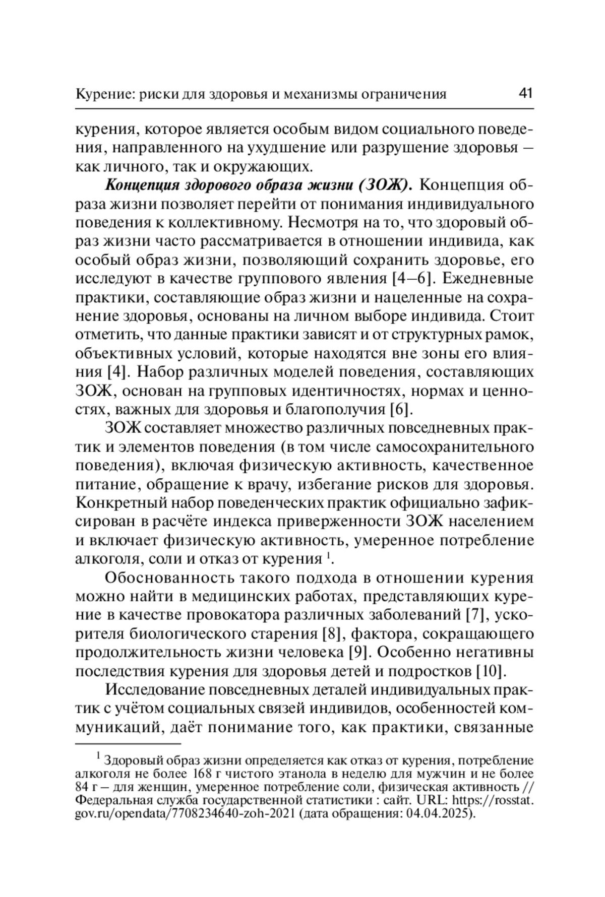 На основе данных Росстата «Выборочное наблюдение состояния здоровья населения» (СЗН), проведённого в 2024 году во всех субъектах РФ, рассматриваются риски поведения в отношении здоровья, связанные с курением индивидов в возрасте от 15 лет и старше. В рамках социологии здоровья с использованием поведенческого подхода (концепции здорового образа жизни, самосохранительного поведения, солютогенеза) рассмотрены социальные механизмы воздействия на индивидуальное и коллективное поведение в отношении поведения, связанного с риском в отношении здоровья на примере курения. Несмотря на усилия последних лет по борьбе с курением, законодательное обоснование запрета на курение в общественных местах и ограничения по продаже табачных изделий, молодёжь начинает курить достаточно рано. Согласно данным ежедневно активно курят 16% россиян, не каждый день – 2,3%, создавая риски для собственного здоровья и здоровья окружающих. В качестве основных структурных ограничений курения и связанного с ним вреда, определены механизмы, действующие на разных уровнях: макроуровень (государственный – разработка законодательства и запуск национальных проектов), мезоуровень (уровень организаций, исполняющих законодательство и предлагающих собственные инициативные проекты), индивидуальный (уровень взаимодействия индивида в малых социальных группах). Наиболее действенные механизмы, ограничивающие курение, – культурные, основанные на традициях здорового поведения. Государственные механизмы основаны прежде всего на запретительных мерах в отношении курения. В качестве наиболее действенной меры гражданами признан запрет на продажу табака несовершеннолетним (67%).