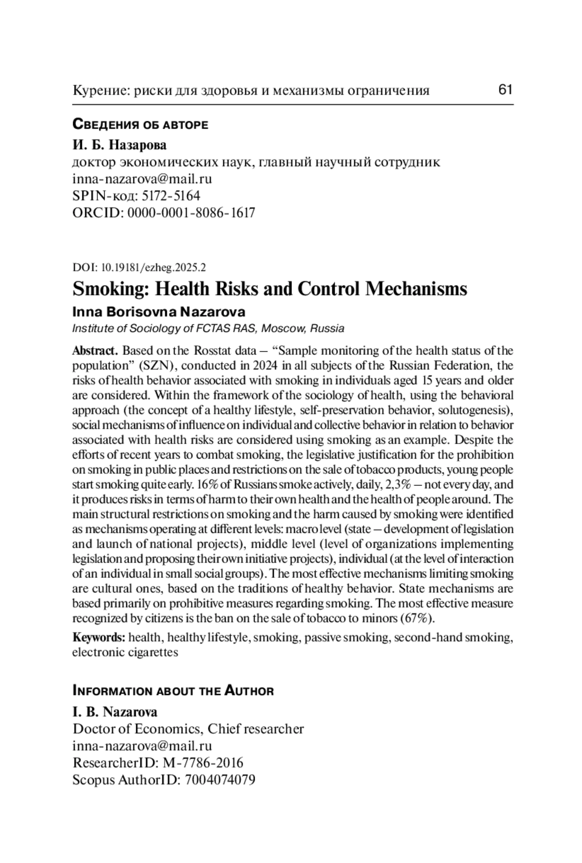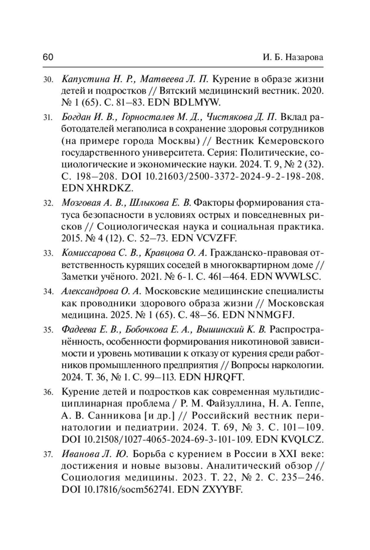 37. Иванова Л. Ю. Борьба с курением в России в ХХI веке: достижения и новые вызовы. Аналитический обзор // Социология медицины. 2023. Т. 22, № 2. С. 235-246.