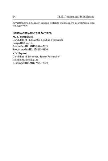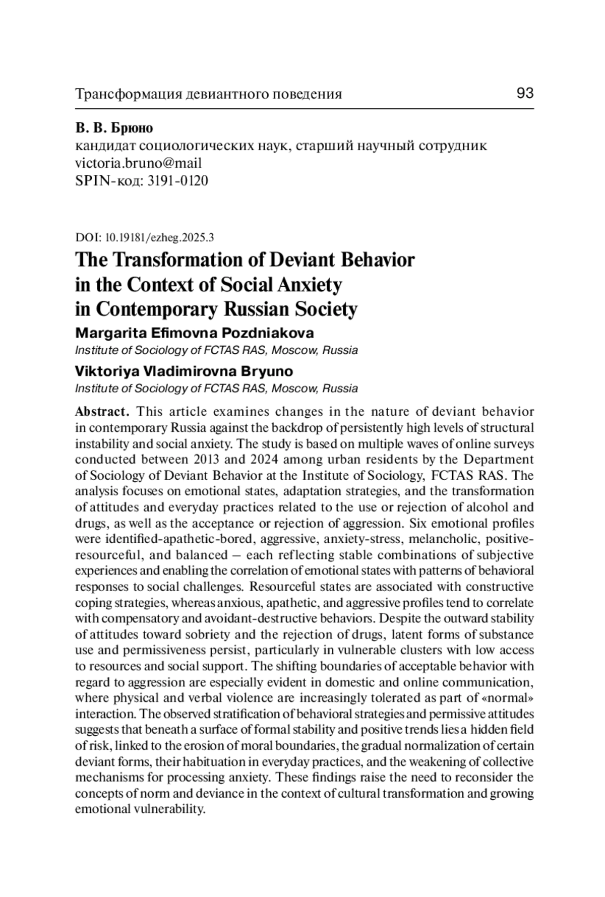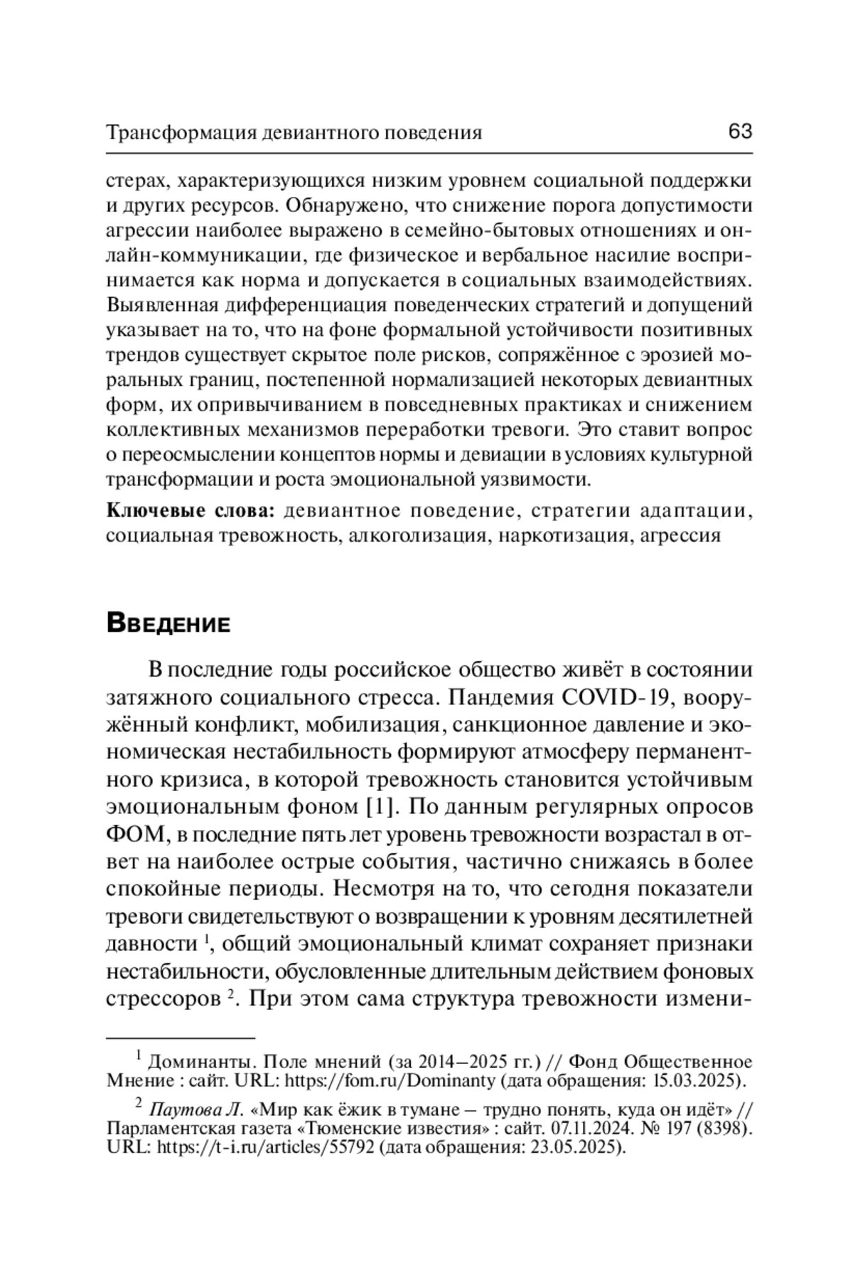 В статье рассматриваются изменения в характере девиантного поведения в современной России на фоне устойчиво высокого уровня структурной нестабильности и социальной тревожности. Исследование основано на материалах нескольких волн онлайн-опросов городского населения, проведённых Сектором социологии девиантного поведения Института социологии ФНИСЦ РАН в 2013–2024 годах. Анализируются эмоциональные состояния, стратегии адаптации, а также трансформация установок и повседневных практик, связанных с употреблением или отказом от алкоголя и наркотиков, а также с допущением или неприятием агрессии. Выделены шесть эмоциональных профилей респондентов (апатично-скучающие, агрессивные, тревожно-стрессовые, меланхоличные, позитивно-ресурсные, уравновешенные), отражающих устойчивые сочетания субъективных переживаний и позволяющих сопоставить эмоциональное состояние с характером поведенческих реакций на вызовы социальной среды. Выявлено, что ресурсные состояния ассоциированы с конструктивными формами совладания, тогда как тревожные, апатичные и агрессивные профили демонстрируют склонность к компенсаторным и избегающе-деструктивным стратегиям. Установлено, что декларируемые ориентации на трезвость и неприятие наркотиков входят в противоречие с латентными формами потребления и допущения этих девиаций, особенно в уязвимых кластерах, характеризующихся низким уровнем социальной поддержки и других ресурсов. Обнаружено, что снижение порога допустимости агрессии наиболее выражено в семейно-бытовых отношениях и онлайн-коммуникации, где физическое и вербальное насилие воспринимается как норма и допускается в социальных взаимодействиях. Выявленная дифференциация поведенческих стратегий и допущений указывает на то, что на фоне формальной устойчивости позитивных трендов существует скрытое поле рисков, сопряжённое с эрозией моральных границ, постепенной нормализацией некоторых девиантных форм, их опривычиванием в повседневных практиках и снижением коллективных механизмов переработки тревоги. Это ставит вопрос о переосмыслении концептов нормы и девиации в условиях культурной трансформации и роста эмоциональной уязвимости.