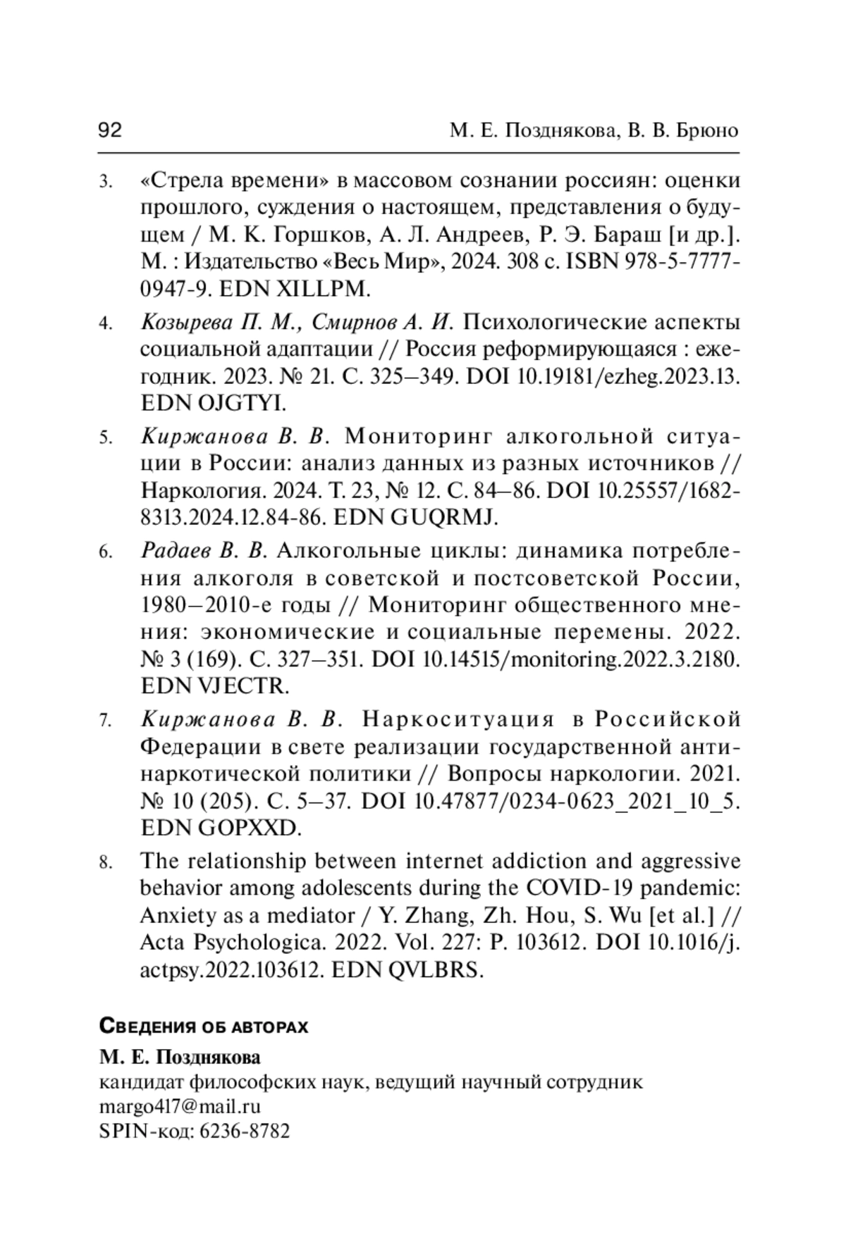 6. Радаев В. В. Алкогольные циклы: динамика потребления алкоголя в советской и постсоветской России, 1980-2010-е годы // Мониторинг общественного мнения: экономические и социальные перемены. 2022. № 3 (169). С. 327-351. DOI: 10.14515/monitoring.2022.3.2180