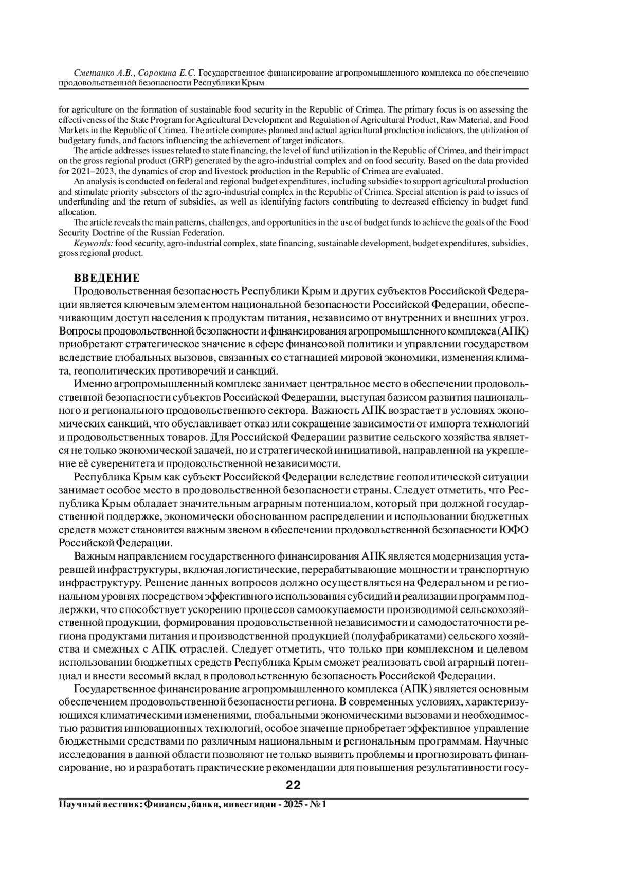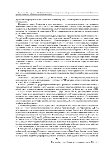 Продовольственная безопасность Республики Крым и других субъектов Российской Федерации является ключевым элементом национальной безопасности Российской Федерации, обеспечивающим доступ населения к продуктам питания, независимо от внутренних и внешних угроз. Вопросы продовольственной безопасности и финансирования агропромышленного комплекса (АПК) приобретают стратегическое значение в сфере финансовой политики и управлении государством вследствие глобальных вызовов, связанных со стагнацией мировой экономики, изменения климата, геополитических противоречий и санкций.