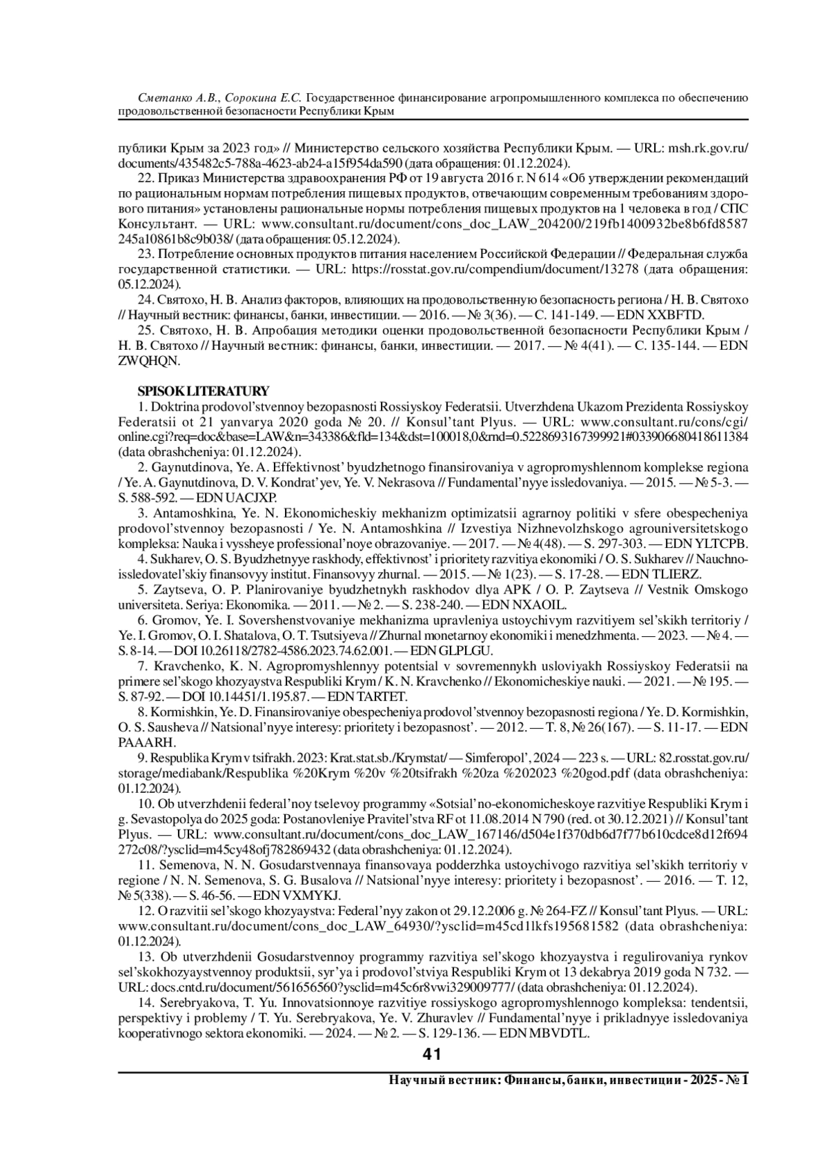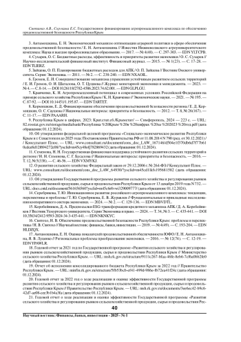 16. Святохо, Н. В. Обеспечение продовольственной безопасности Республики Крым: проблемы и перспективы / Н. В. Святохо // Научный вестник: финансы, банки, инвестиции. - 2019. - № 4(49). - С. 193-204. EDN: HLDZQX