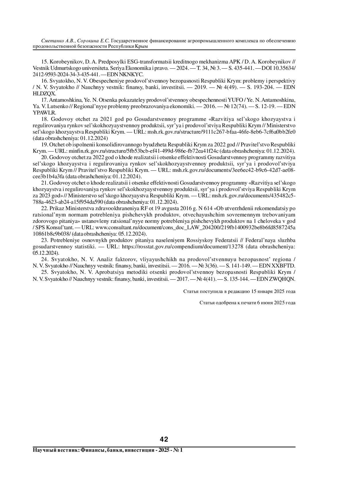 25. Святохо, Н. В. Апробация методики оценки продовольственной безопасности Республики Крым / Н. В. Святохо // Научный вестник: финансы, банки, инвестиции. - 2017. - № 4(41). - С. 135-144. EDN: ZWQHQN